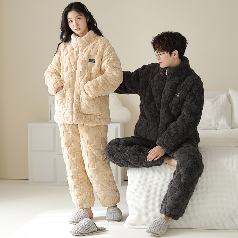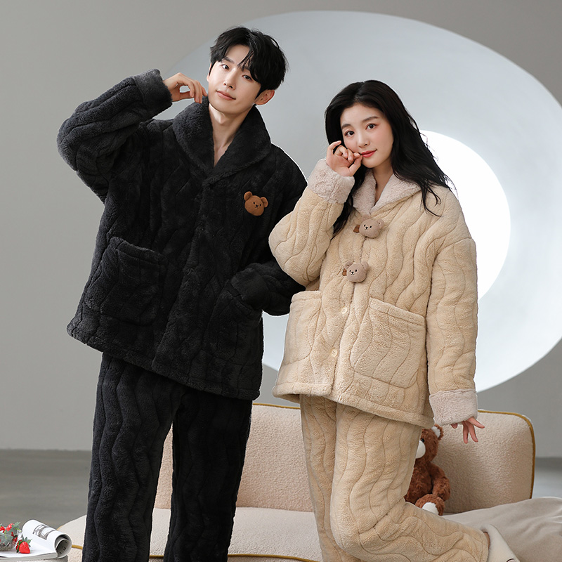 情侣睡衣秋冬季珊瑚绒一男一女加厚加绒三层夹棉可外穿家居服套装