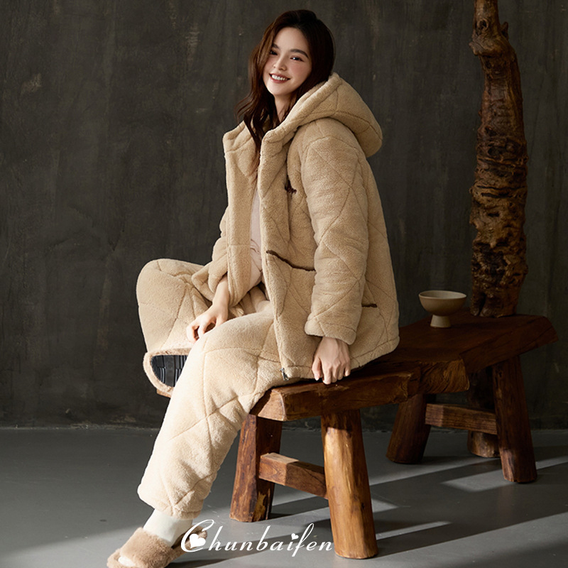 淳佰芬睡衣女冬季三层加厚夹棉天鹅绒珊瑚绒休闲连帽家居服可外穿