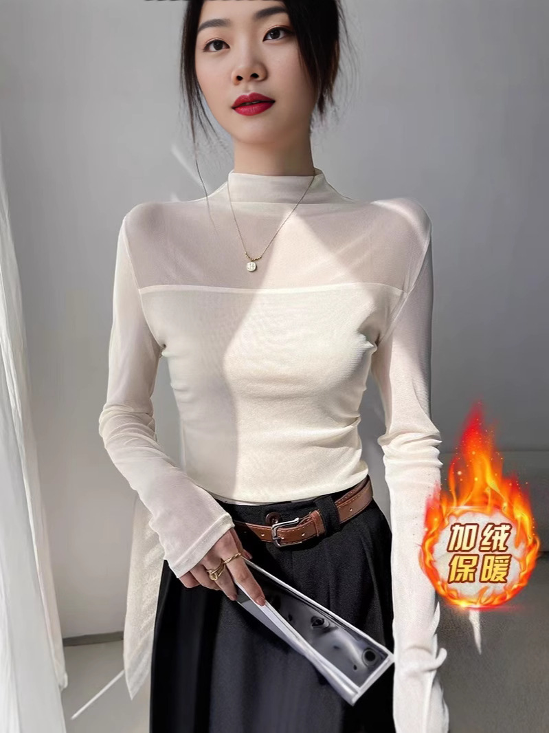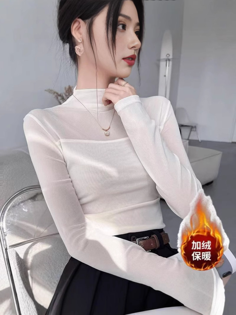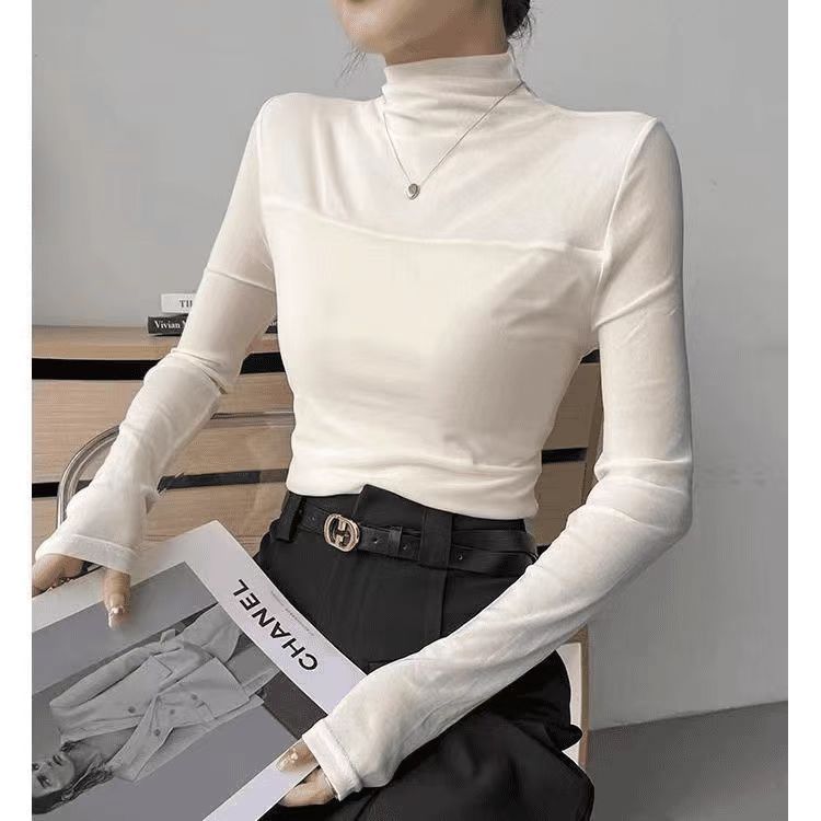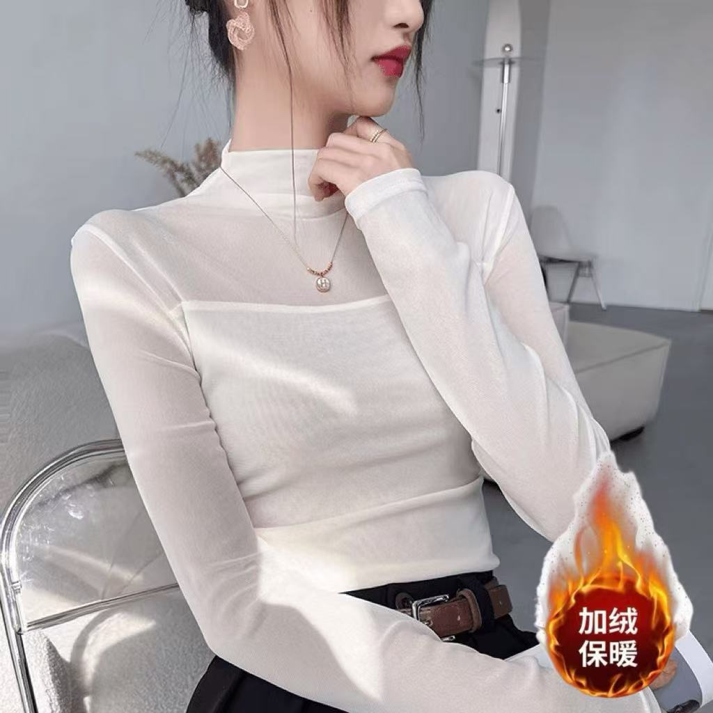 (加绒不加价)半高领网纱气质打底衫女春秋季修身显瘦T恤内搭上衣