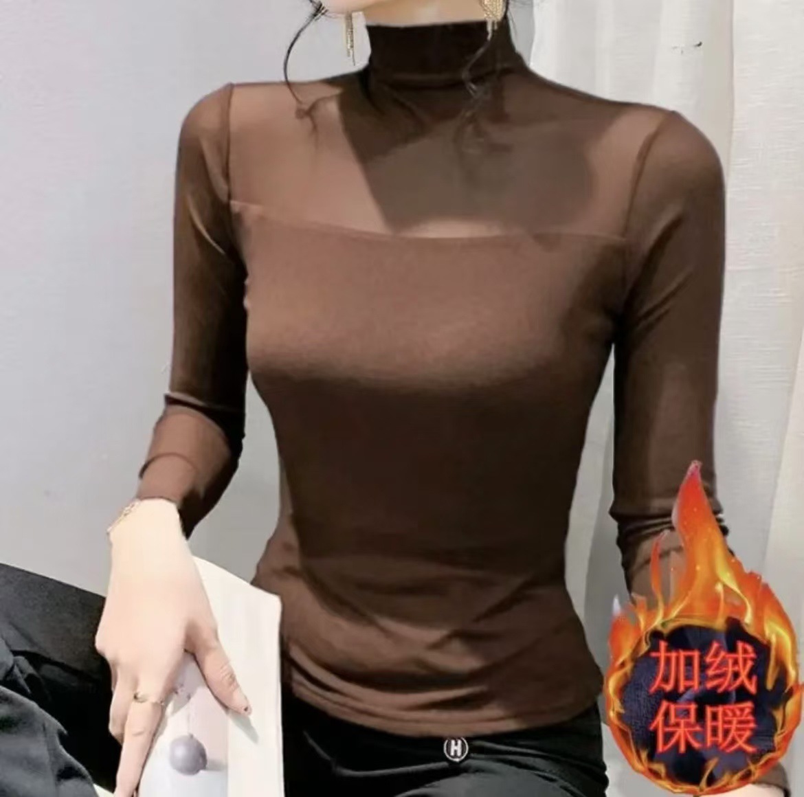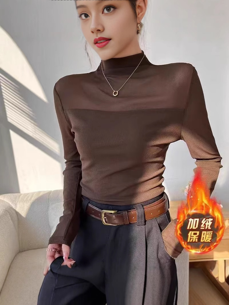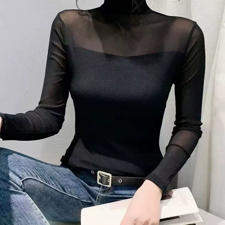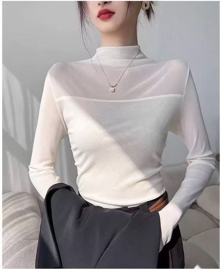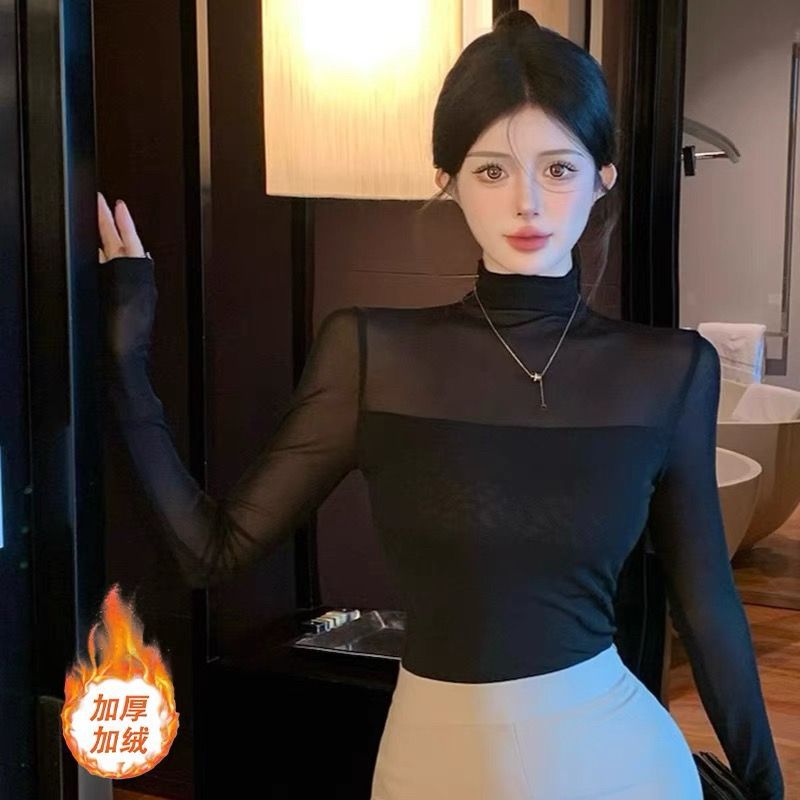 (加绒不加价)半高领网纱气质打底衫女春秋季修身显瘦T恤内搭上衣