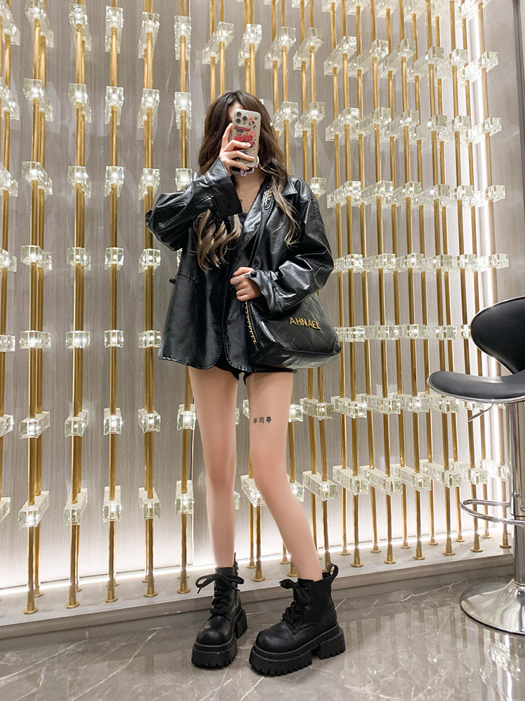 2025秋冬の黒い中筒の丸い頭の現物の女性の厚い底のマーティンの靴のファッションのゴムの靴の女性の皮の靴