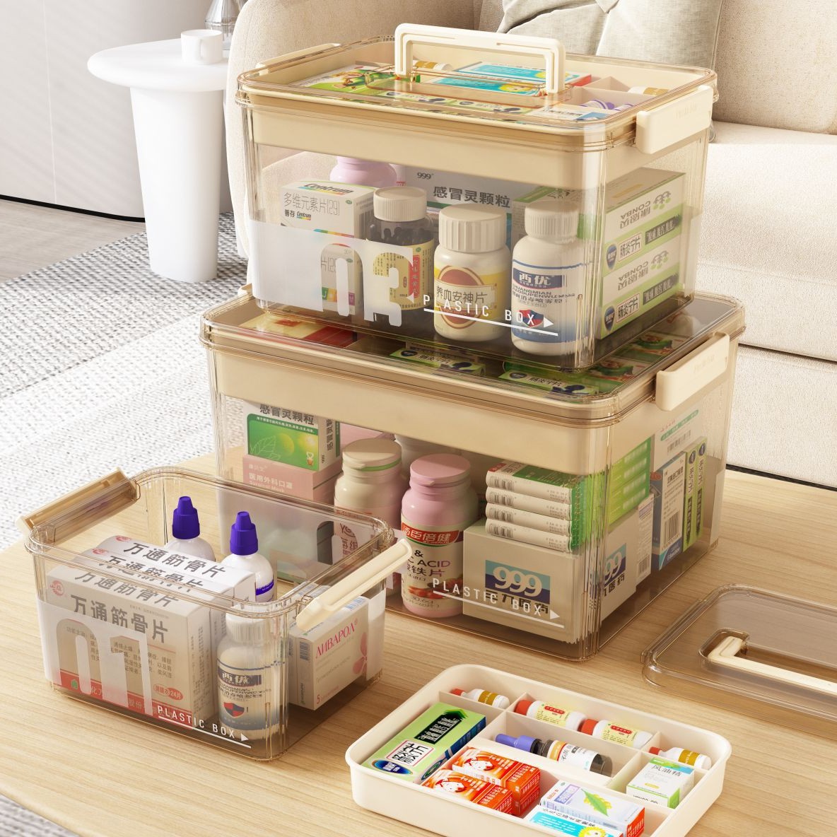 ポータブル薬箱、家庭用透明大容量収納ボックス、大型ファミリーサイズ、中仕切り付き薬箱