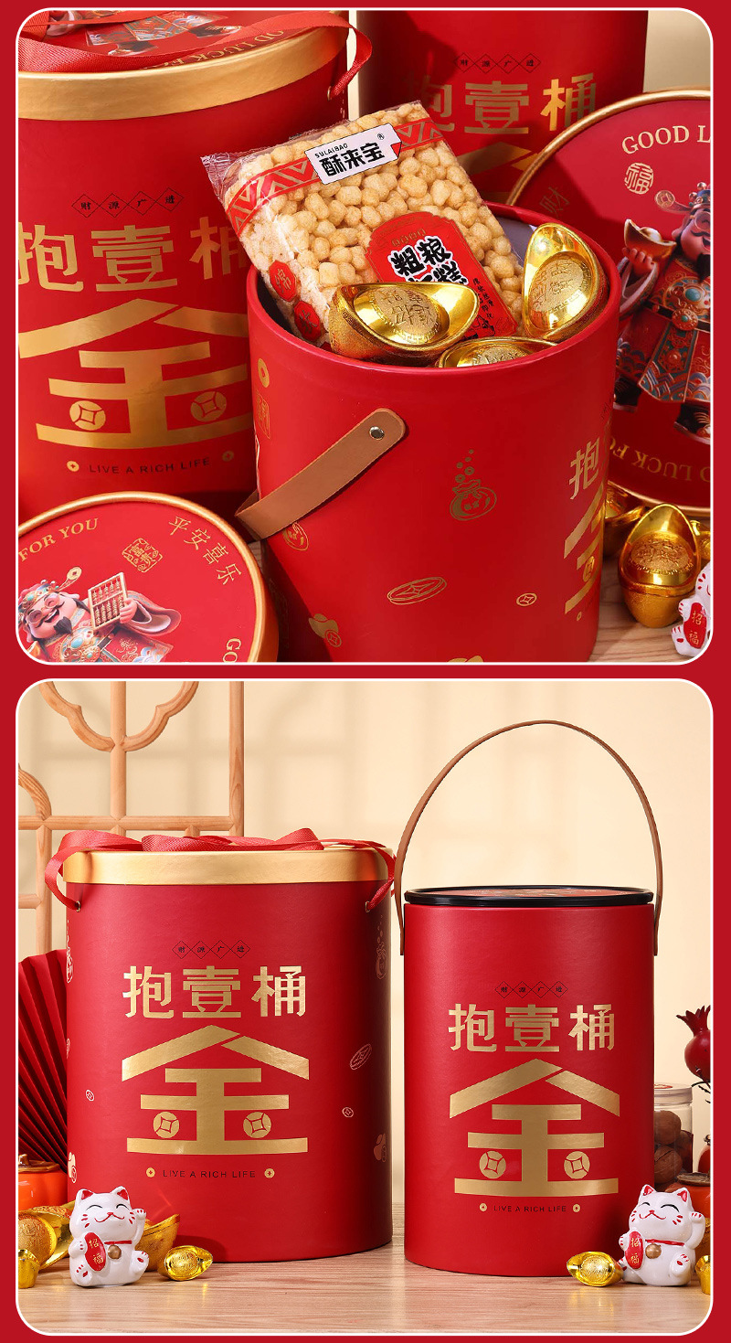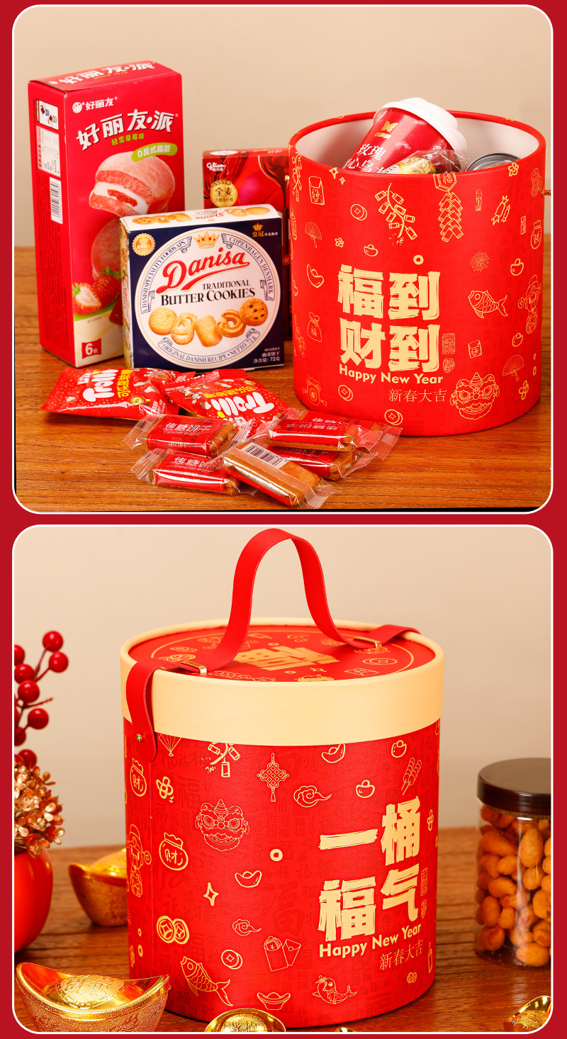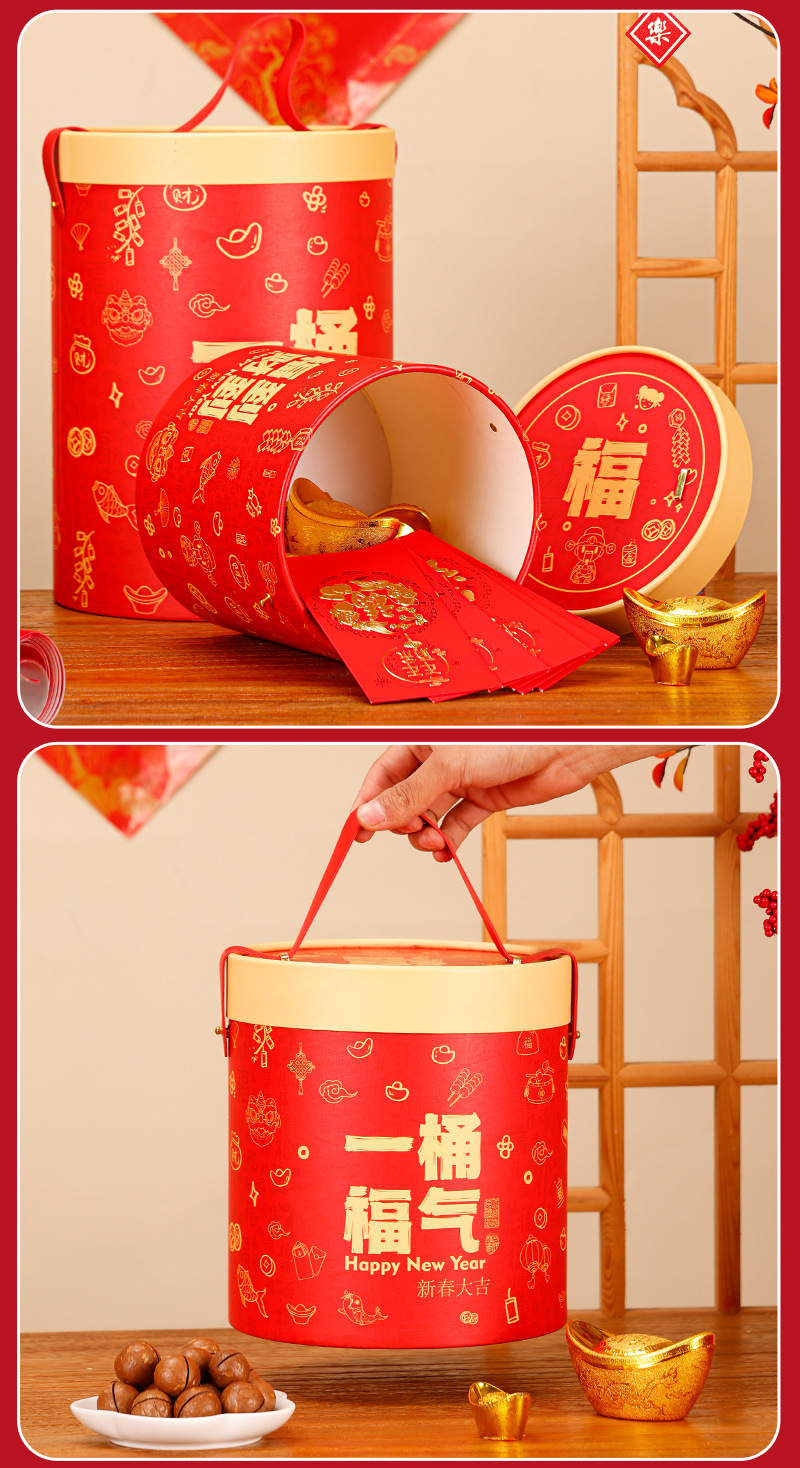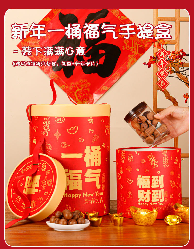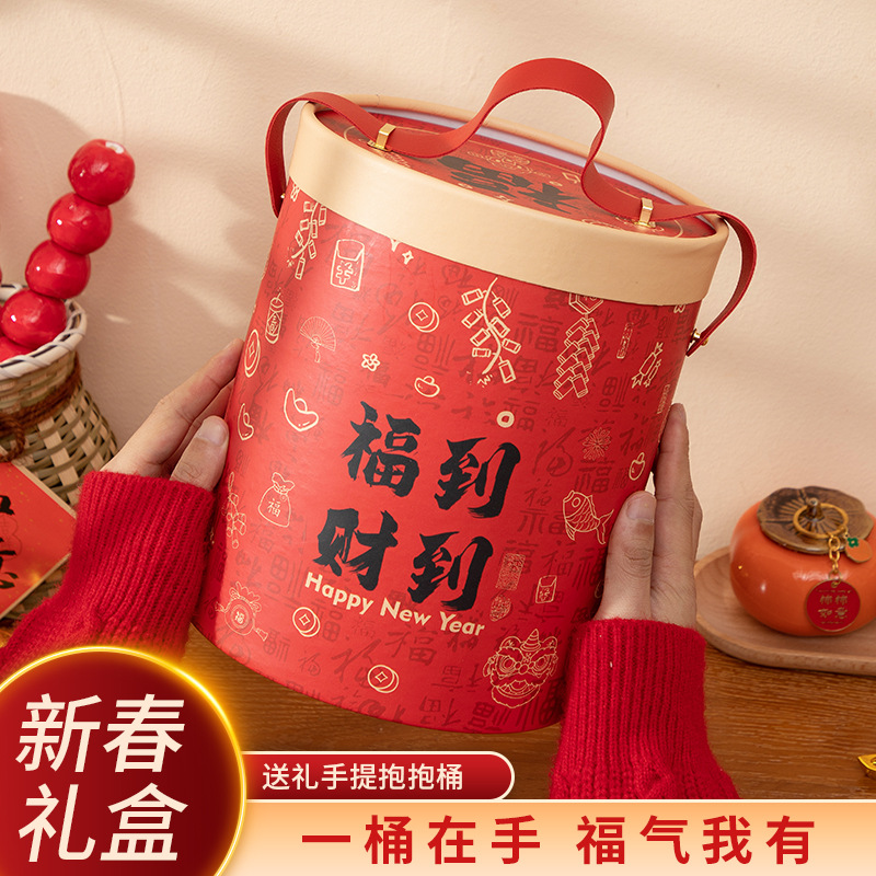 新年礼盒零食空盒春节年货包装春节年货圆形手提坚果礼品盒抱抱桶