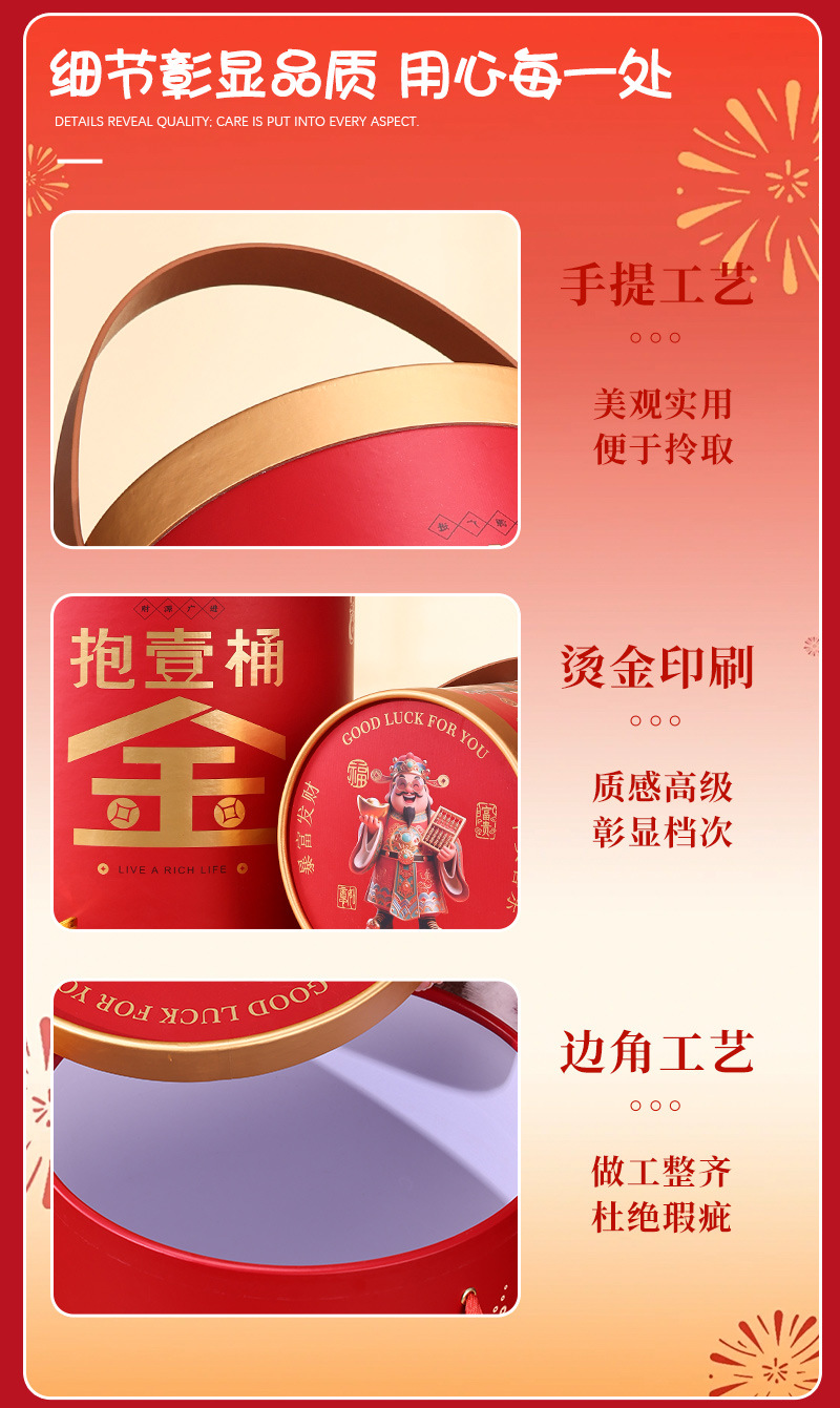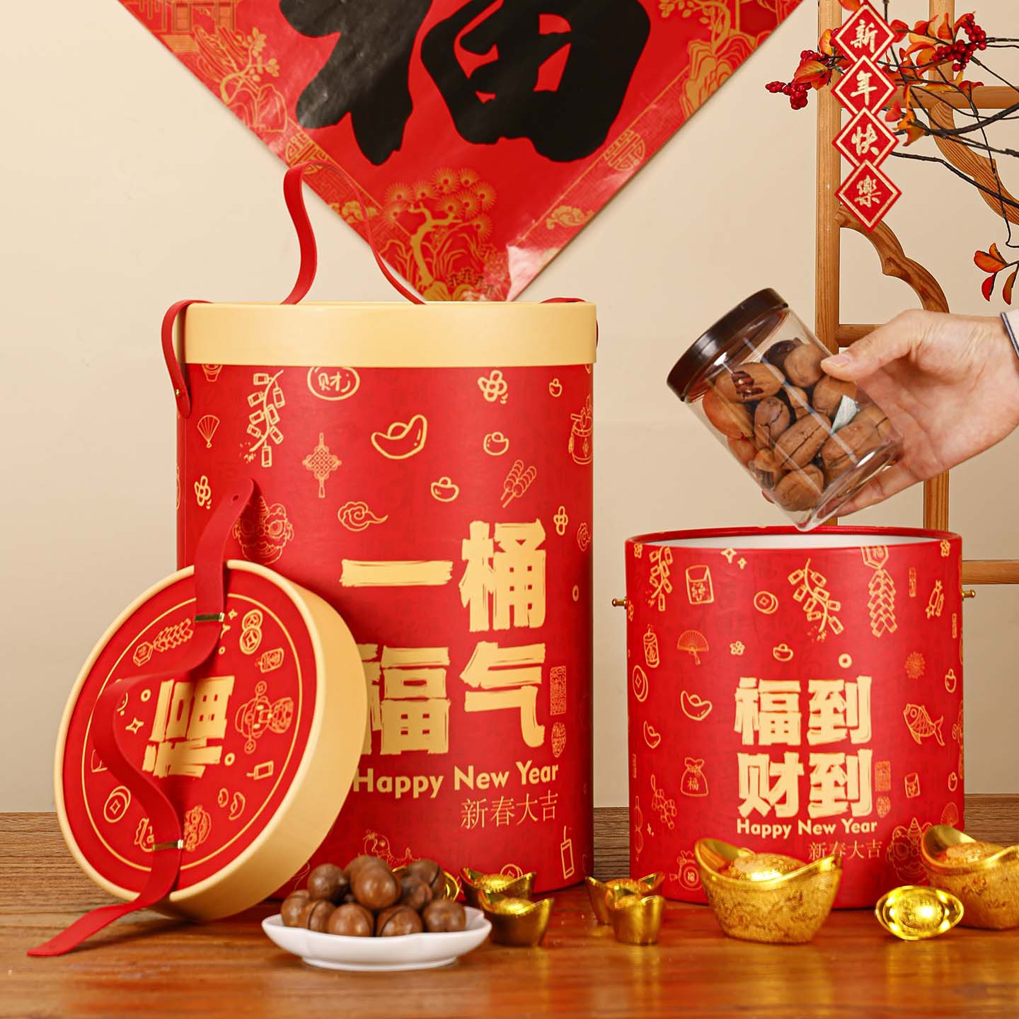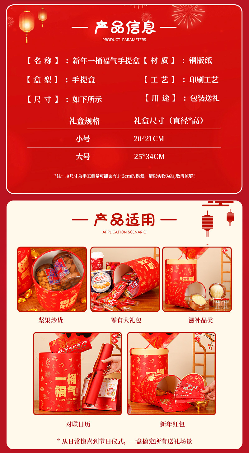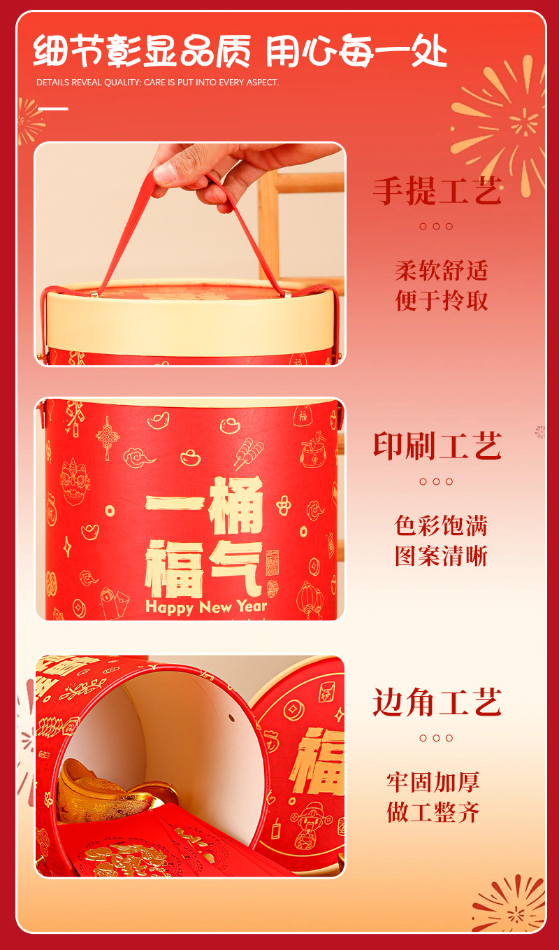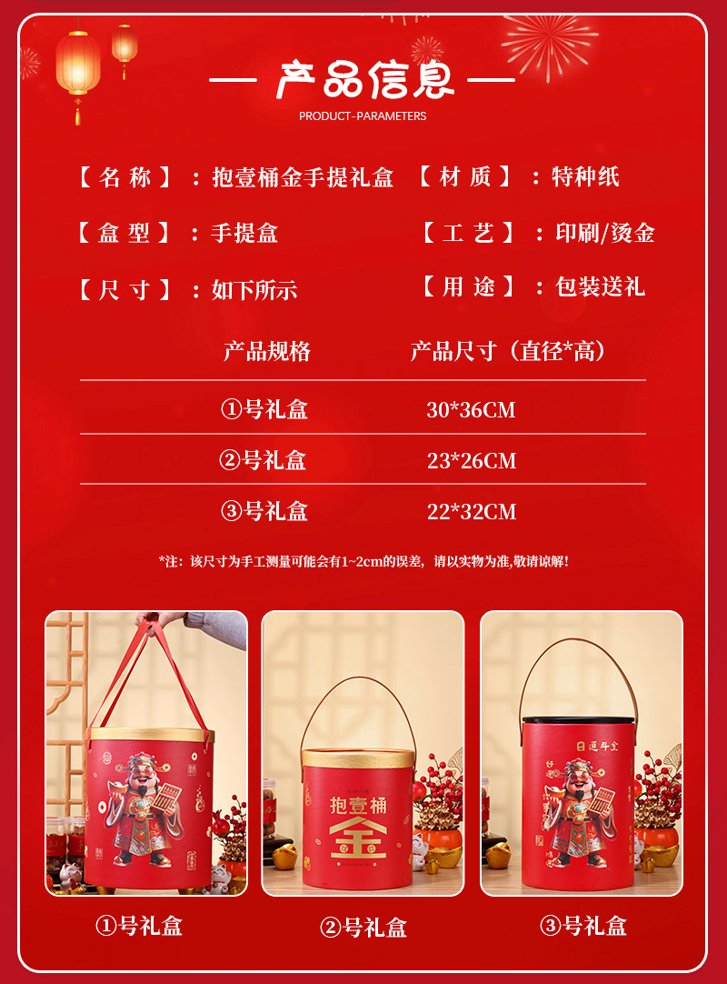 新年礼盒零食空盒春节年货包装春节年货圆形手提坚果礼品盒抱抱桶