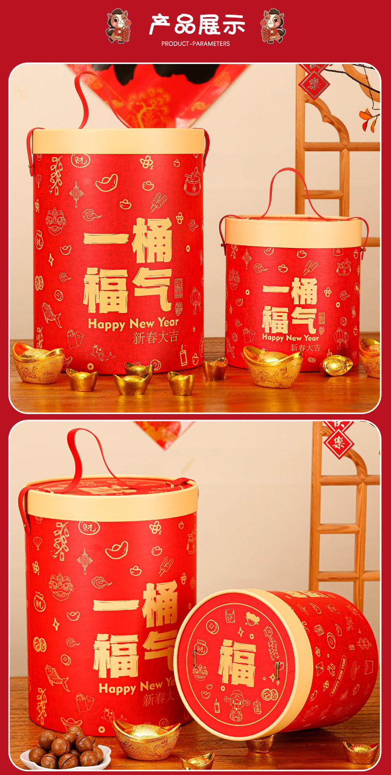 新年ハグバケツギフトボックス赤い大型収納ボックス新年グッズナッツスナック包装ボックス馬年ギフトボックス在庫あり