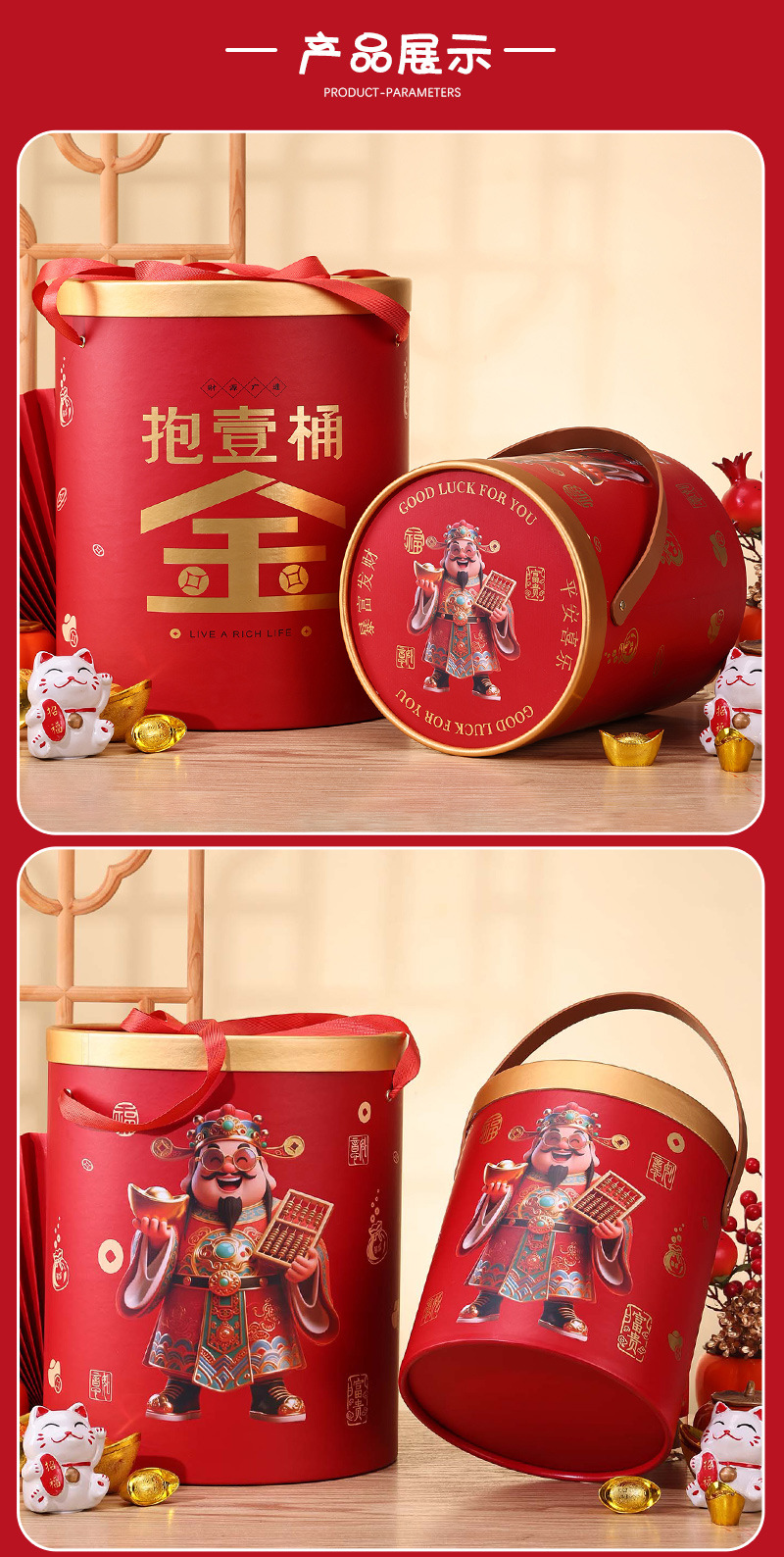 仕様とモデル 祝福のバケツ、Lサイズ - 直径25×高さ33cm,幸運と幸運の両開き箱(空箱+ギフトバッグ)、29×20×10cm Sサイズ,幸運と幸運の両開きボックス(空箱+ギフトバッグ)、36×28×12cm Lサイズ,お正月両開きボックス Sサイズ 29×21×9cm,お正月両開きボックス Lサイズ 35×26×11cm