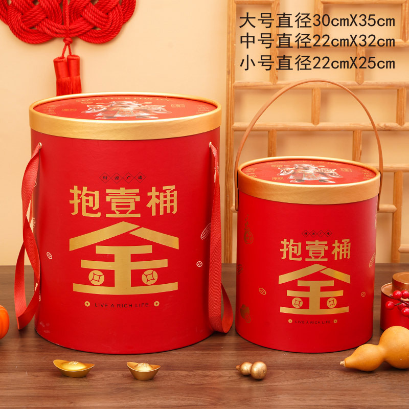 新年抱抱桶零食坚果手提式圆形空桶发财纸罐子新年送礼包装盒现货