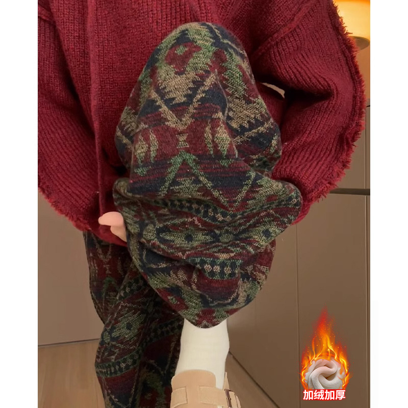 民族風とベルベットのワイドパンツ女性秋冬の新しい毛は、ジャカードのカジュアルパンツの怠惰な風の狭いストレートパンツです