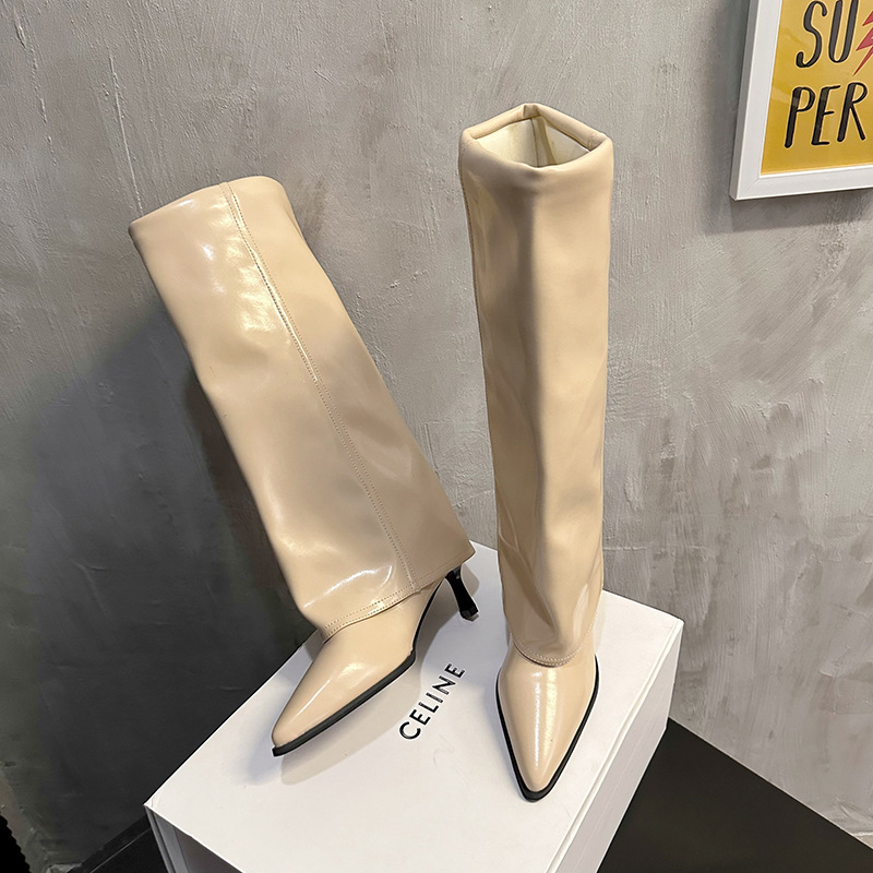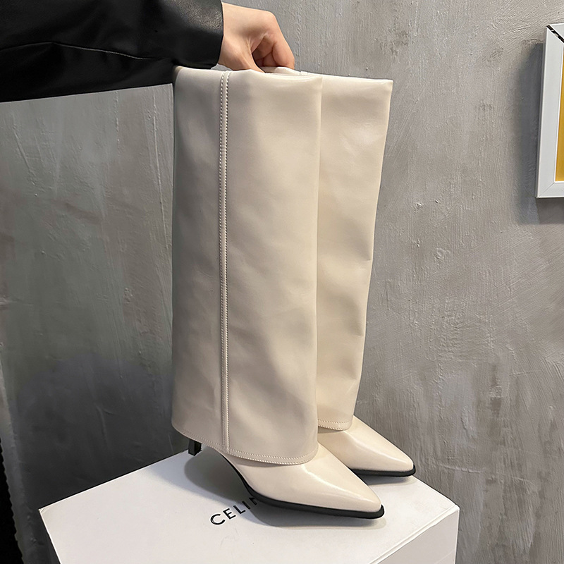先の細い長筒の靴の2024秋冬の新型の米白はやせています。