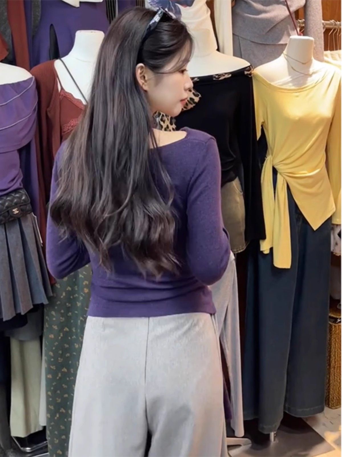 秋冬の甘いギャルの長袖のtシャツのデザイン感の1字の肩のセクシーな純粋な欲の風の修身はやせている大衆の上着のinsを現します。