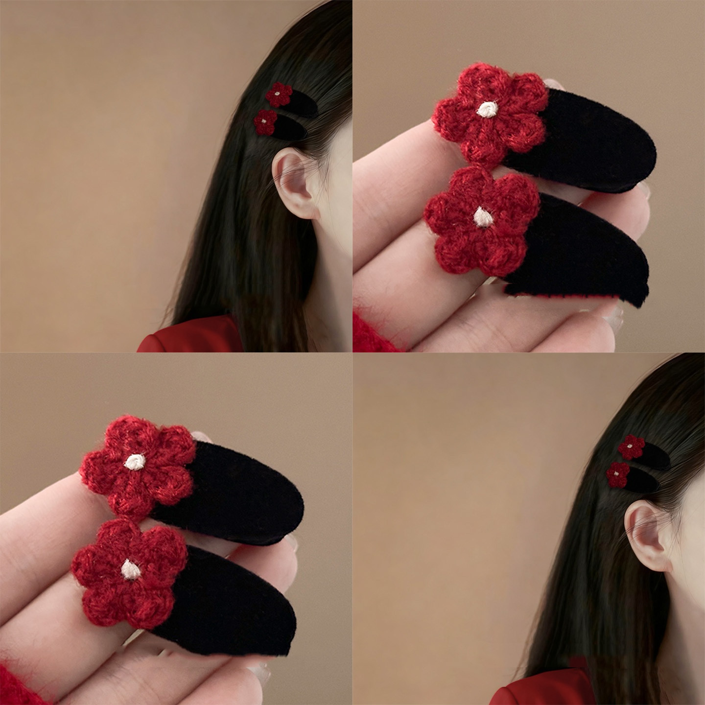 小红花~复古毛线花朵发夹氛围感刘海夹复古时尚边夹发卡秋冬发饰