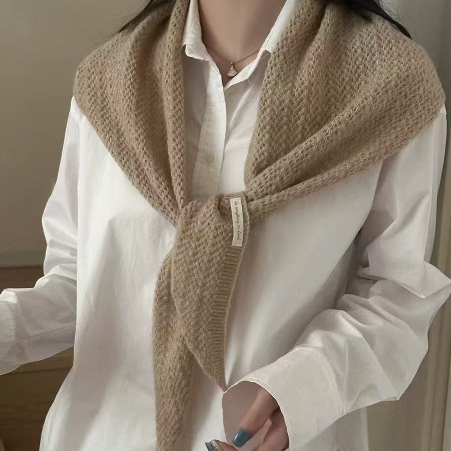 2025新款纯色针织镂空三角巾女秋冬季羊毛百搭护颈围巾打结披肩