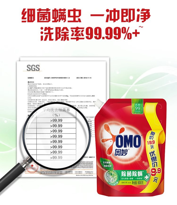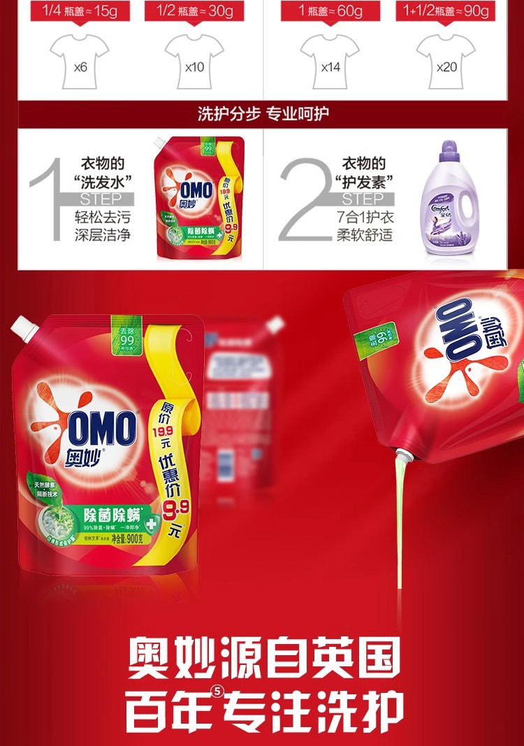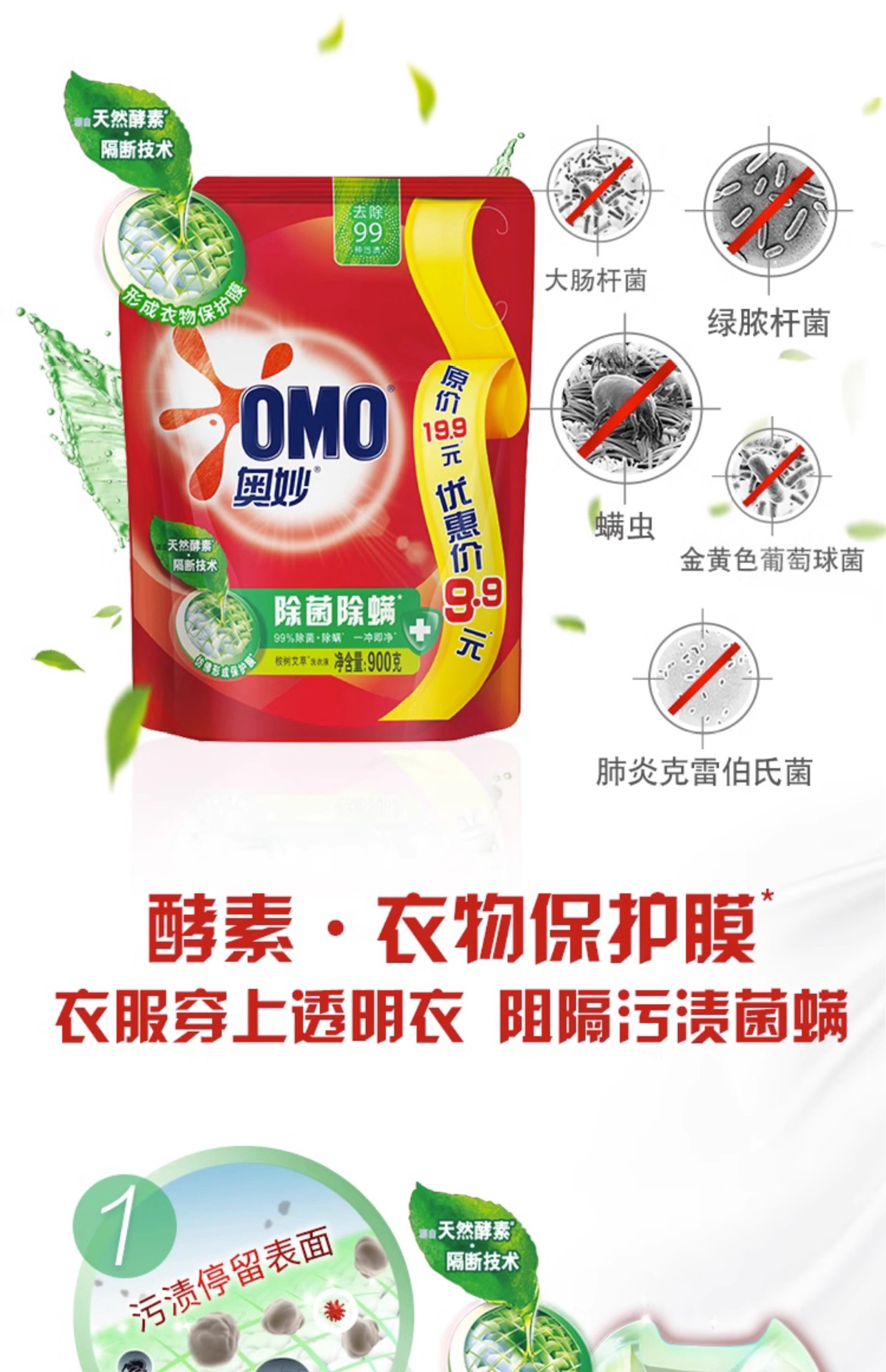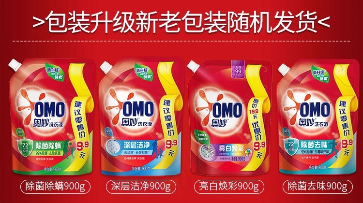 奥妙袋入り補充洗濯液900g深層清潔除菌除ダニ亮白熙彩シャツ衣類卸売り