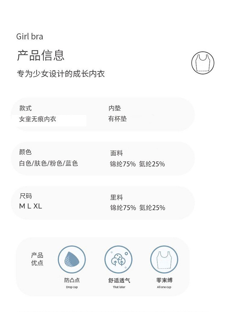 无痕女童内衣发育期10一14岁少女文胸青春期二阶段初中小学生背心