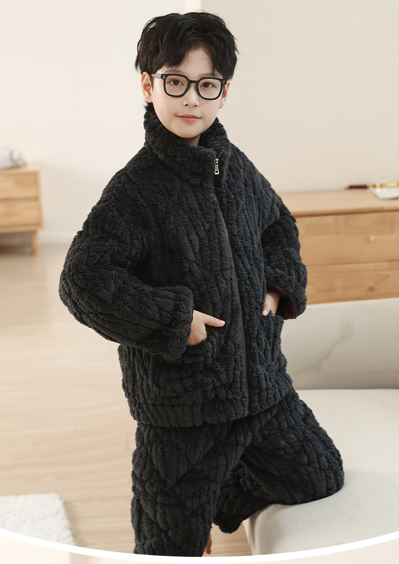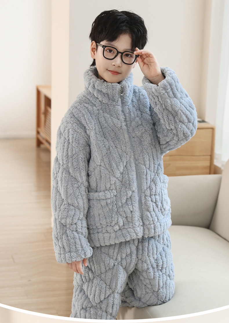 子供用パジャマ三層綿を挟んだ冬の厚手の男の子フランネルの家庭服保温中の子供は冬服を着ている