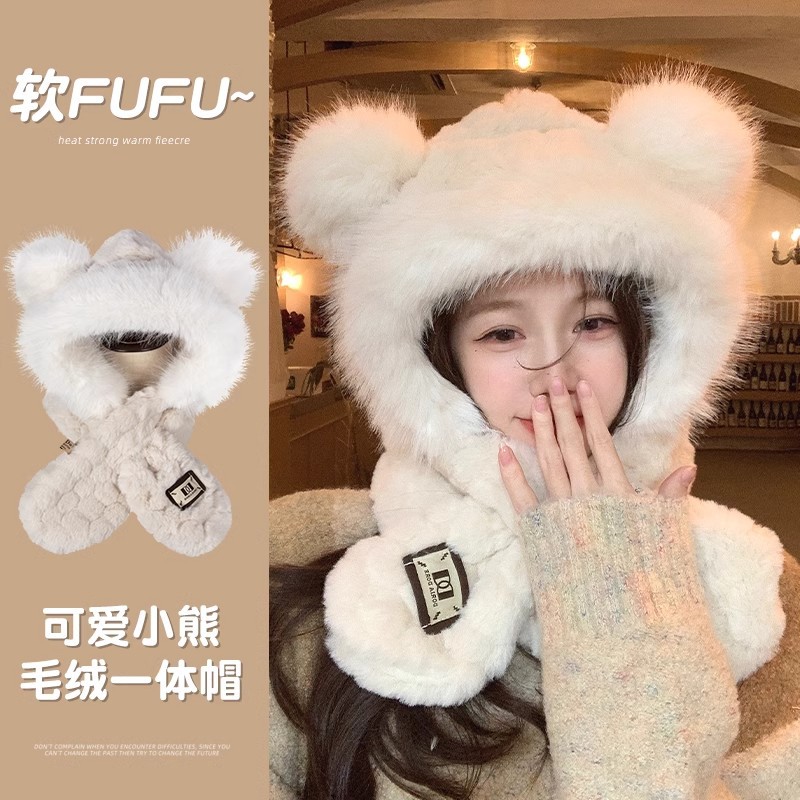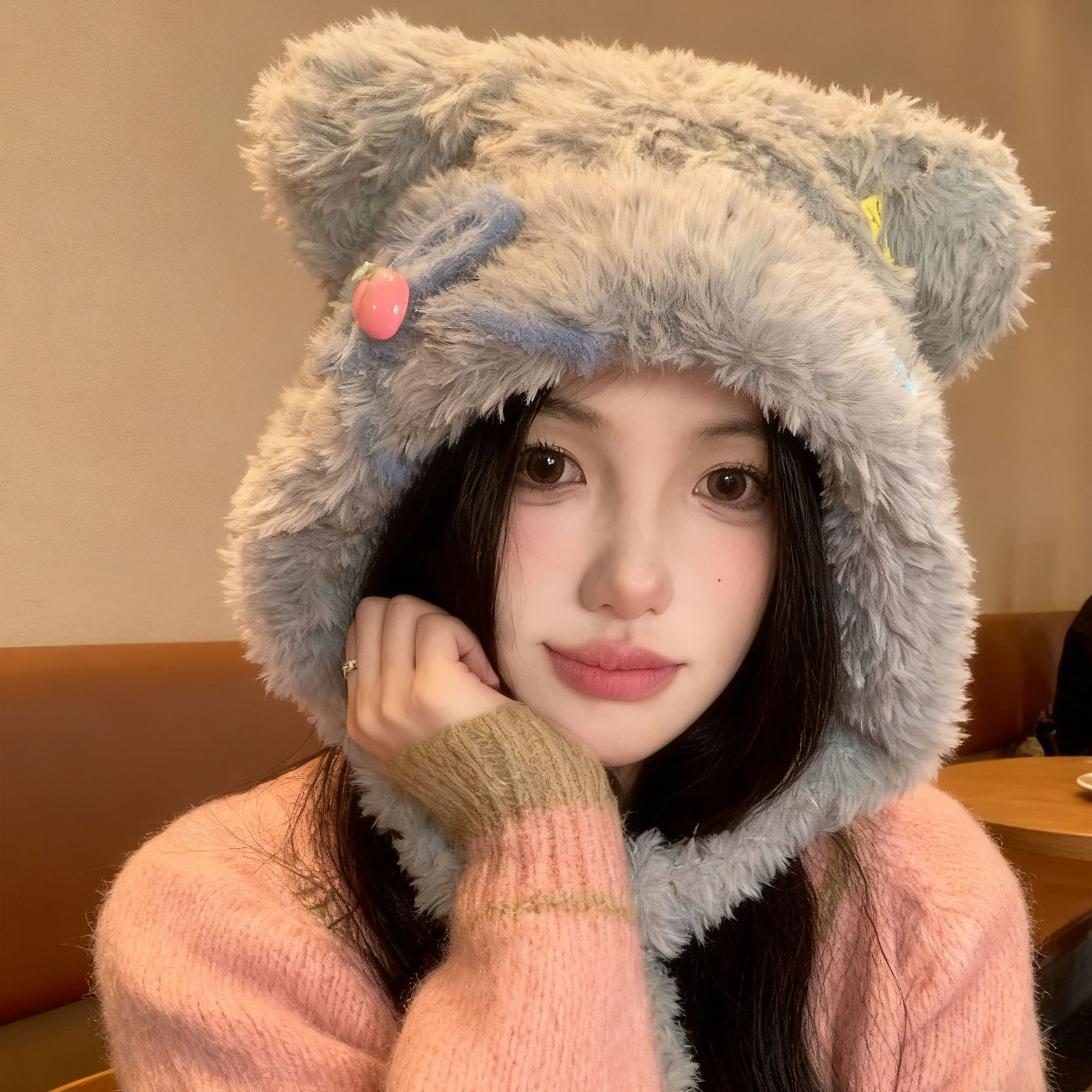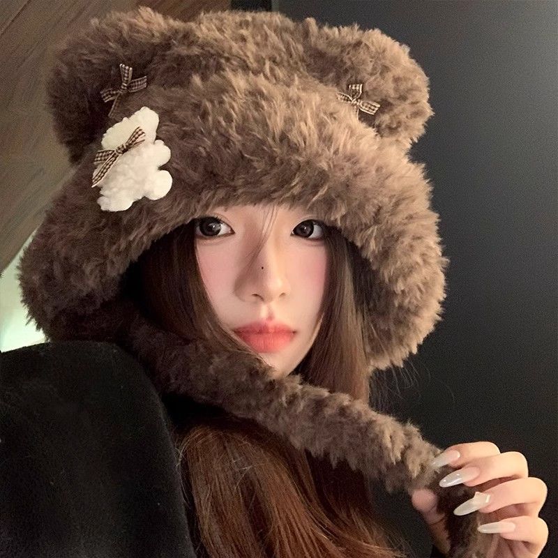 可爱小熊耳朵毛绒套头帽女2025年秋冬季雷锋帽保暖护耳毛茸茸帽子