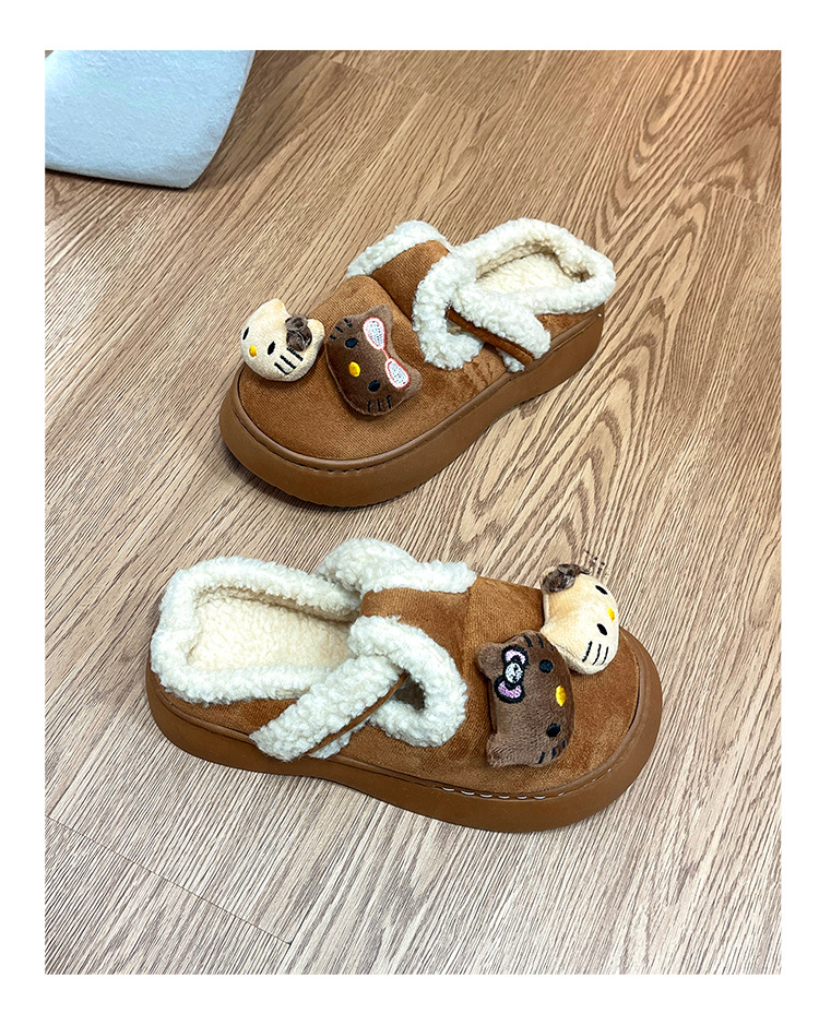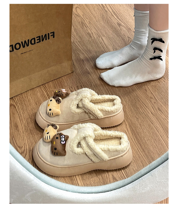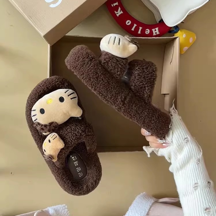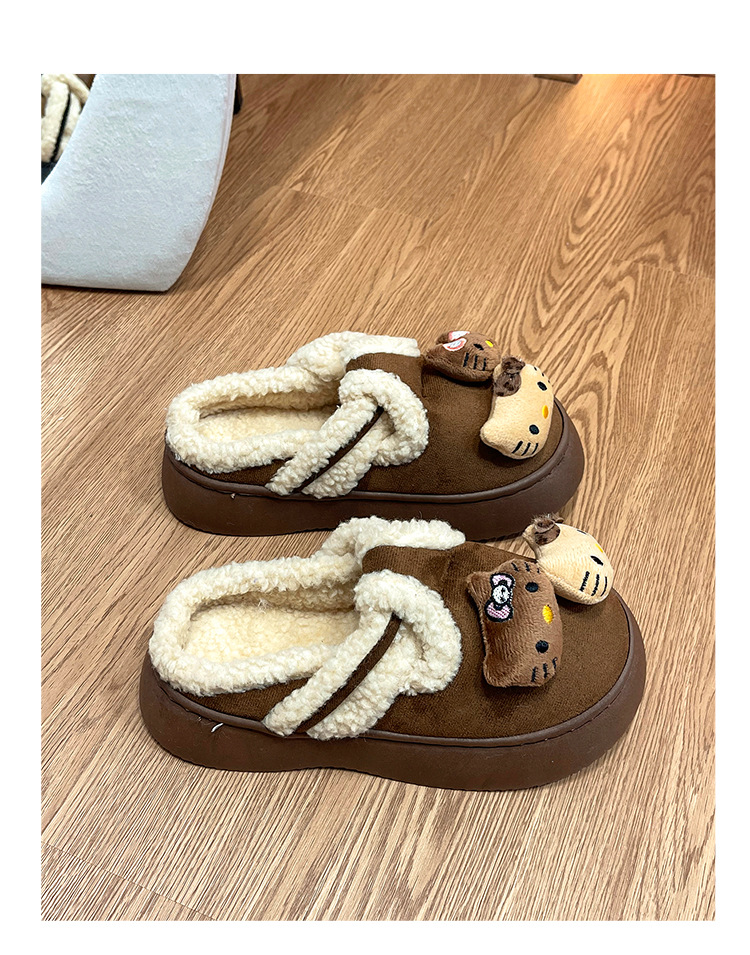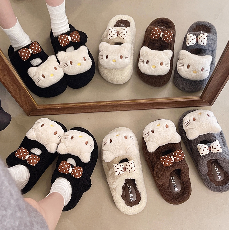 秋冬の女性用の甘くて人気の子猫人形のファースリッパ、屋外でも履ける厚底の暖かい綿スリッパ
