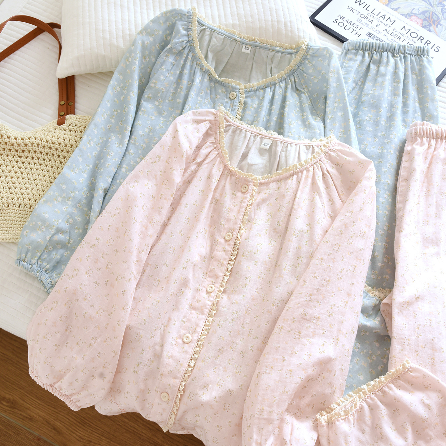 2026田园碎花9分睡衣女士纯棉纱布蕾丝圆领开衫春夏薄家居服套装