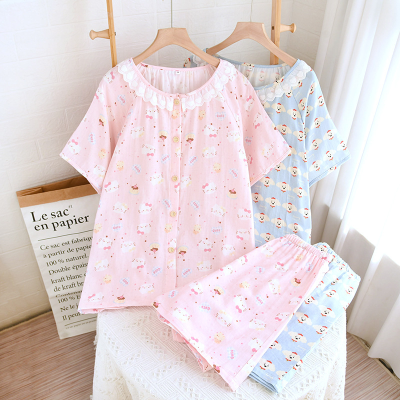 デジタル綿質二重ガーゼレース丸首カーディガンパジャマセット半袖半ズボン