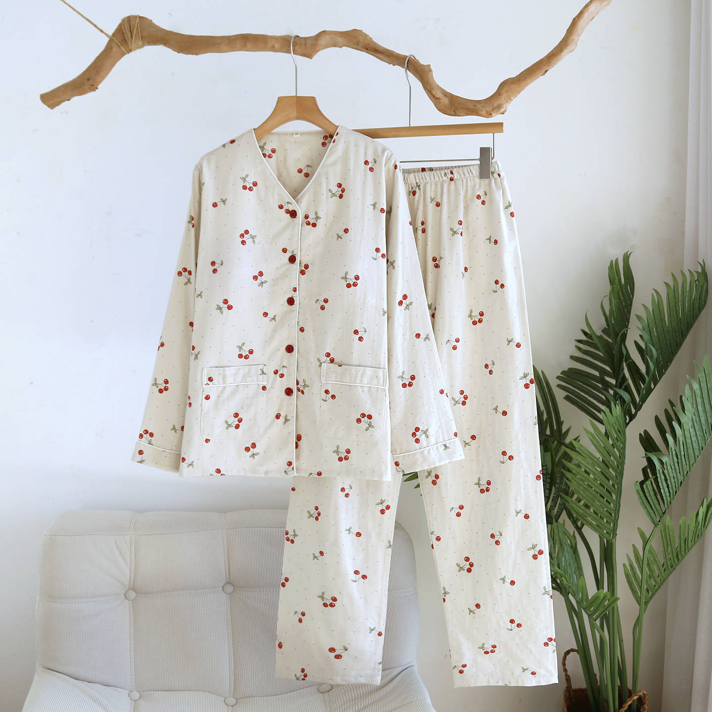 新款樱桃家居服带文胸可拆卸全棉双层纱布长袖长裤女士睡衣