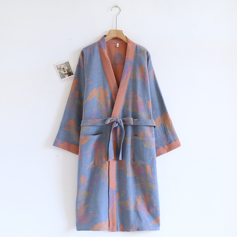 春秋カップル高級色織純綿二重ガーゼ寝衣男中長タイプ国風カーディガン和風浴衣バスローブ