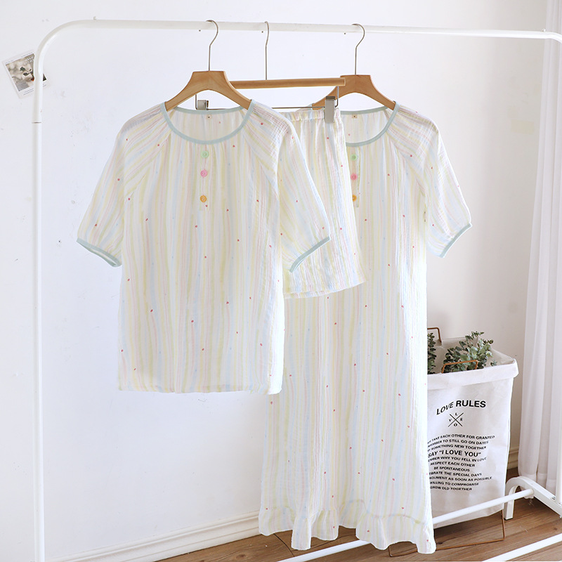 短袖长裤夏季女士睡衣大码家居服可爱纯棉双层纱布半袖套装新款
