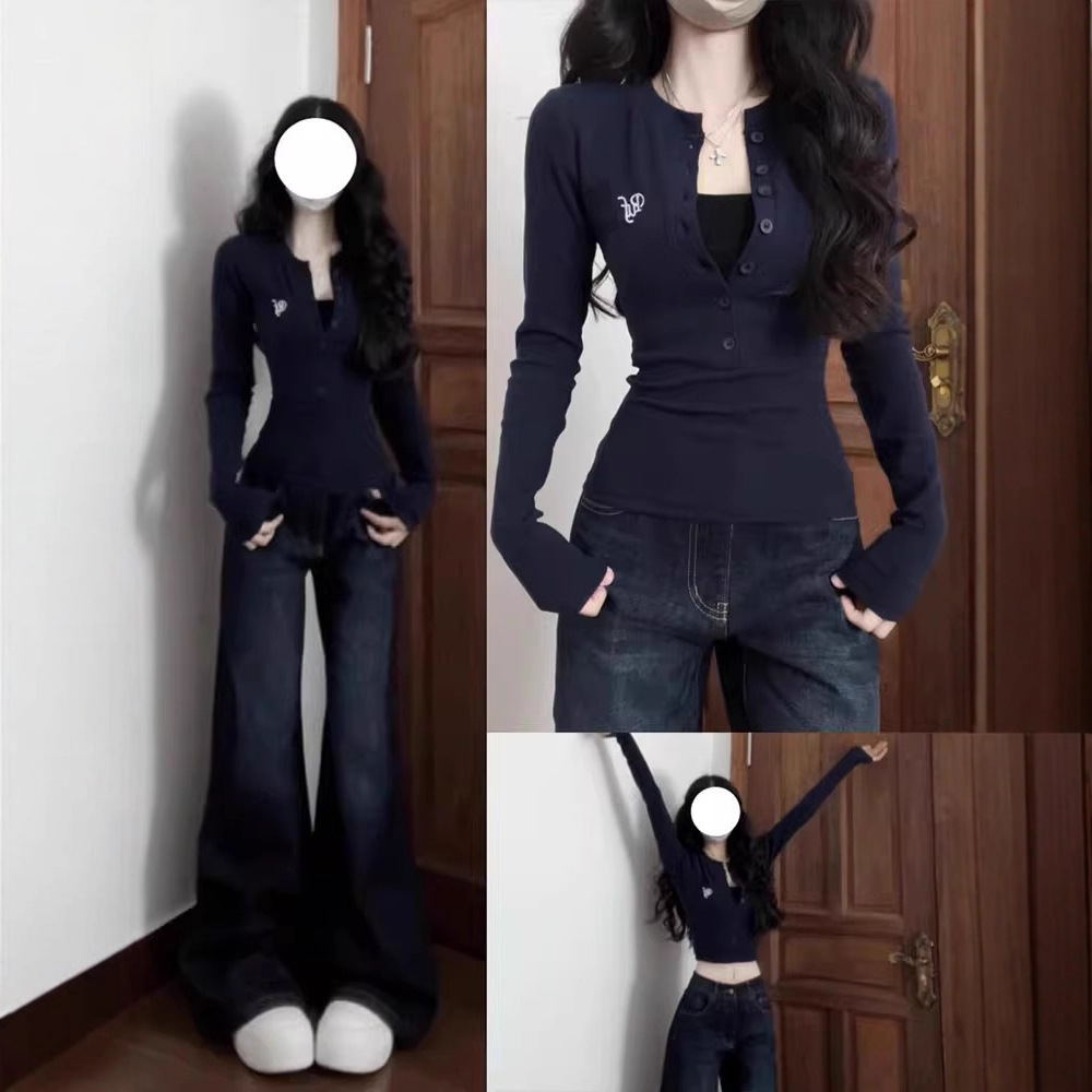 美式辣妹半开领纽扣长袖T恤女秋季新款修身显瘦内搭打底衫上衣潮