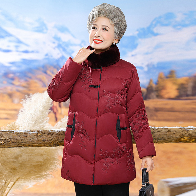 2024高齢者女装おばあちゃん綿服気質ダウンジャケット真毛襟刺繍ママ服コートショートコート