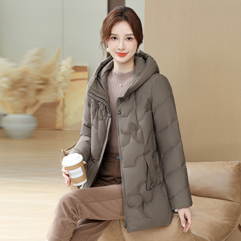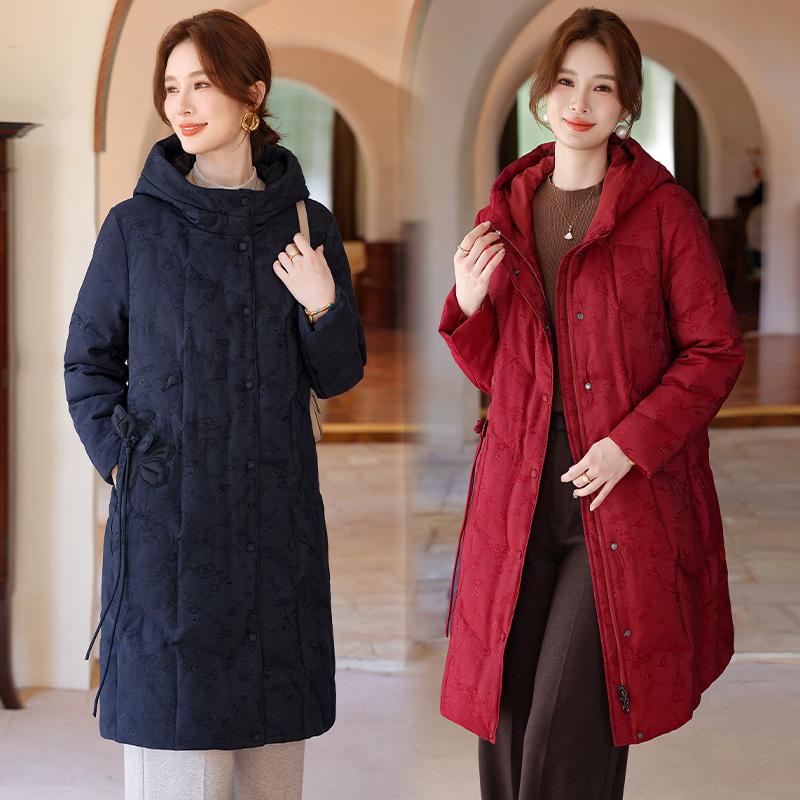 2024中高年コート母ダウンジャケット洋気刺繍フード付きミディアムロング母服上着おばあちゃん冬服