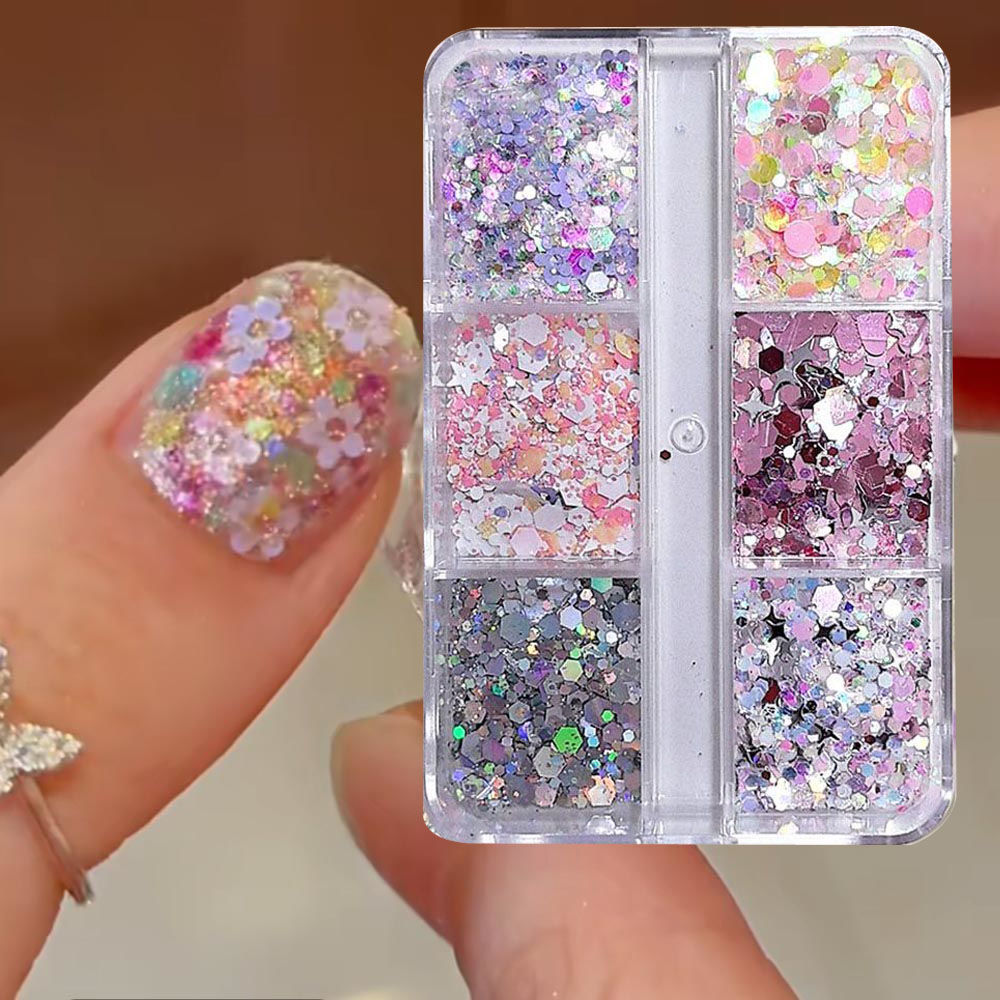 6格美甲饰品亮片花朵闪粉爱心五角星幻彩粉色亮片极光指甲亮片