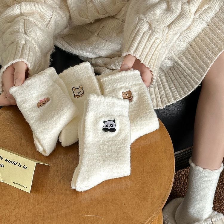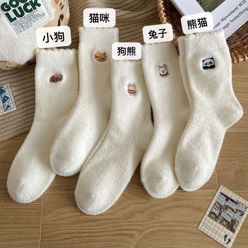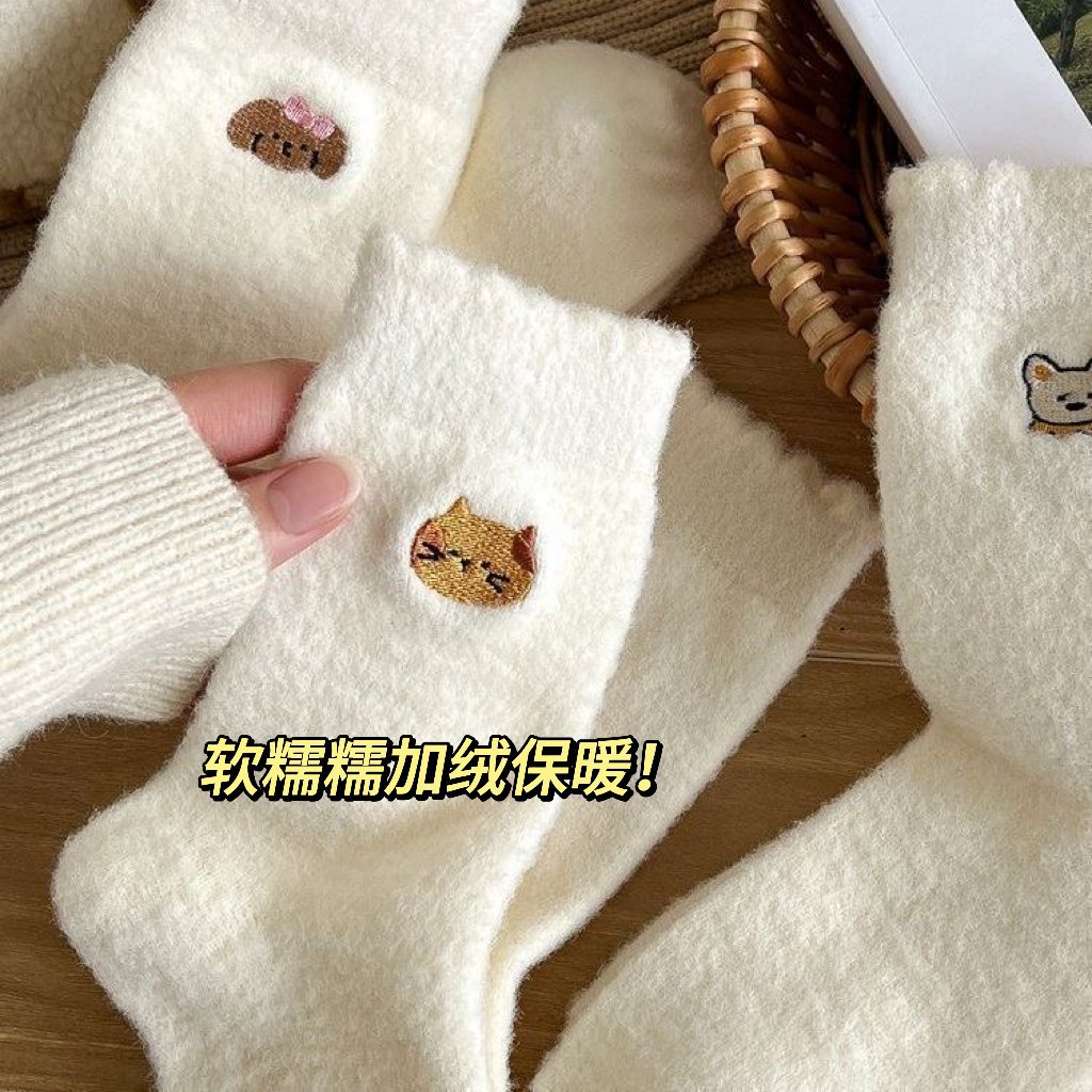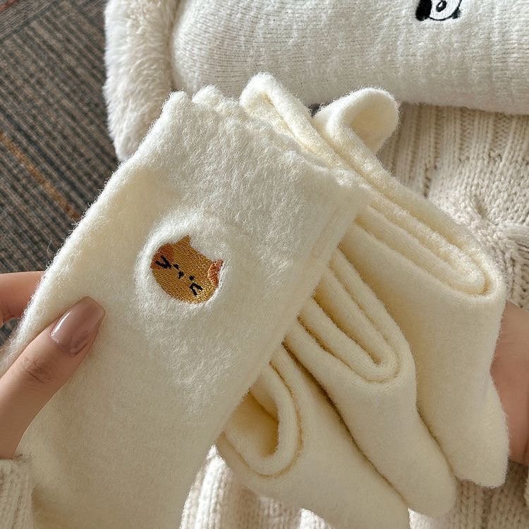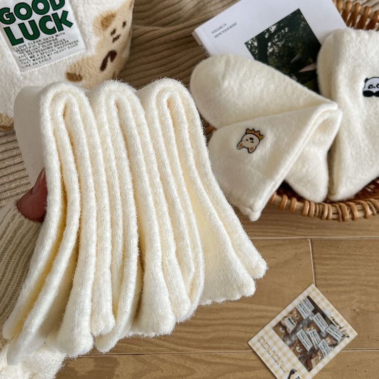 秋冬新款加厚可爱袜子白色女保暖袜中筒袜日系卡通毛绒自发热长袜