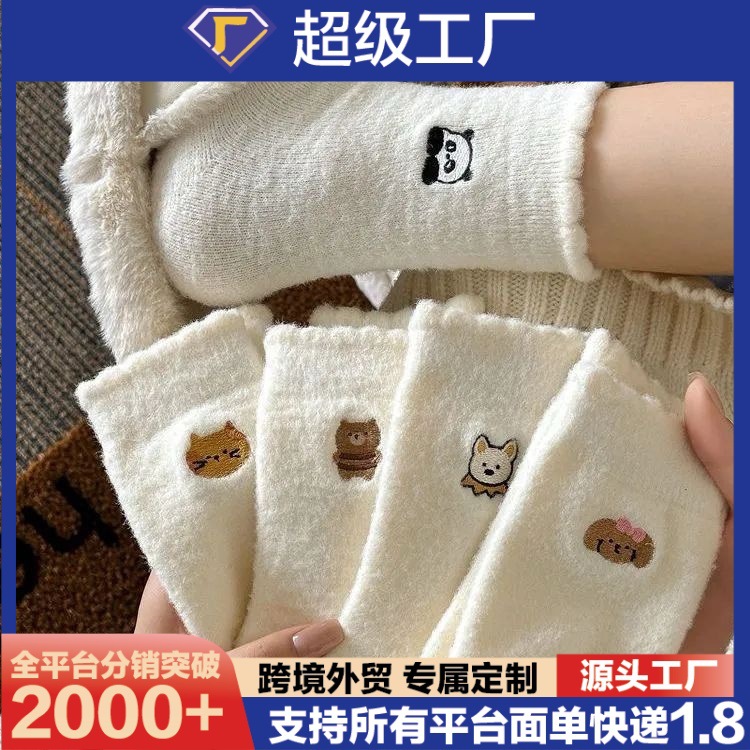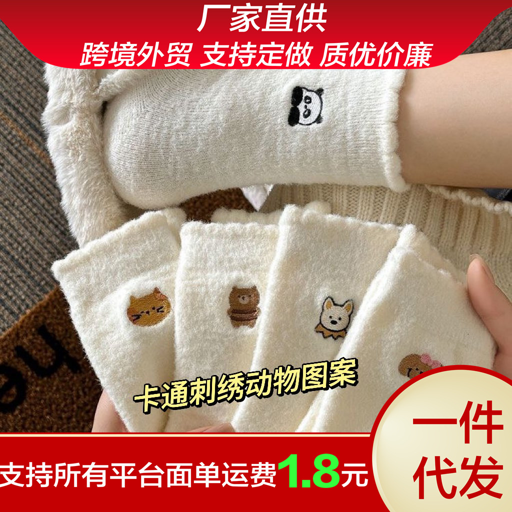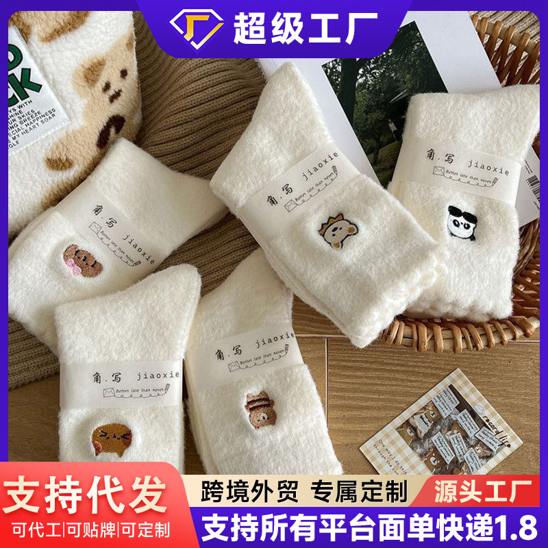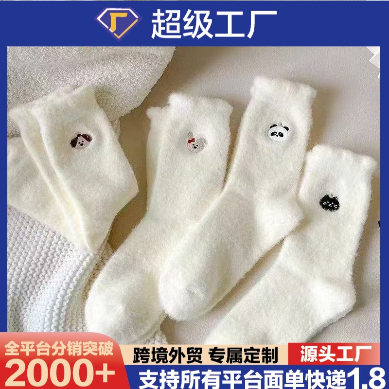 秋冬新款加厚可爱袜子白色女保暖袜中筒袜日系卡通毛绒自发热长袜