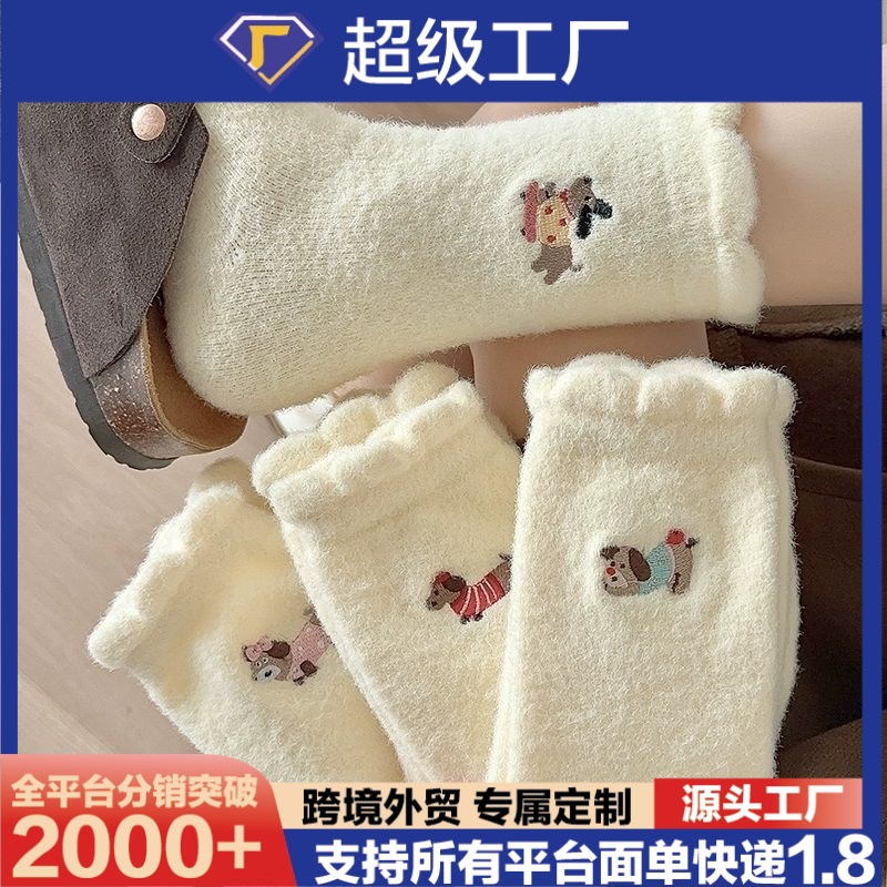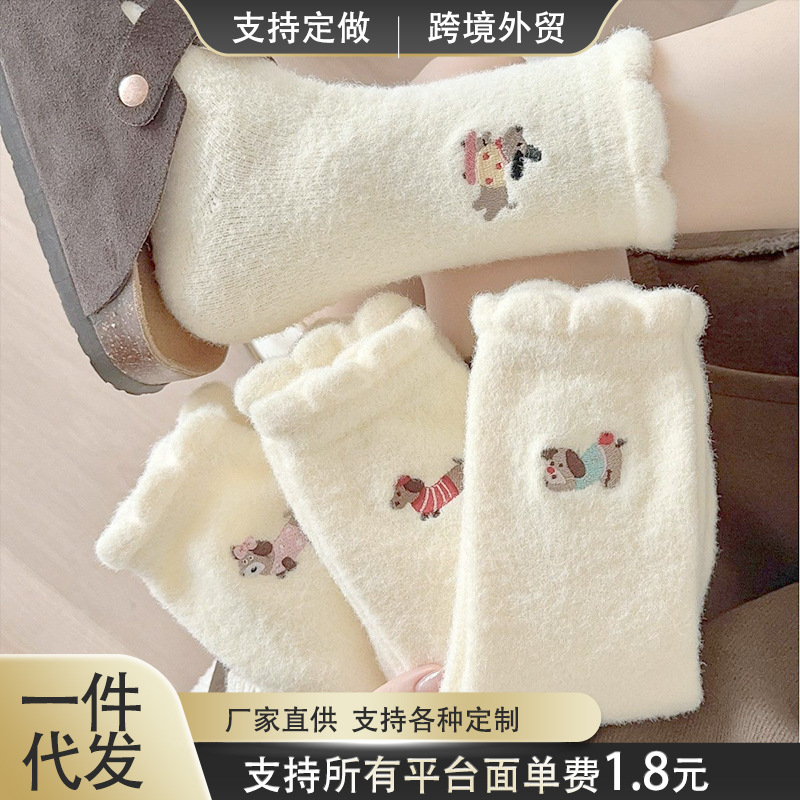 袜子女冬季加绒加厚保暖防寒韩版ins潮卡通可爱小狗中筒袜月子袜