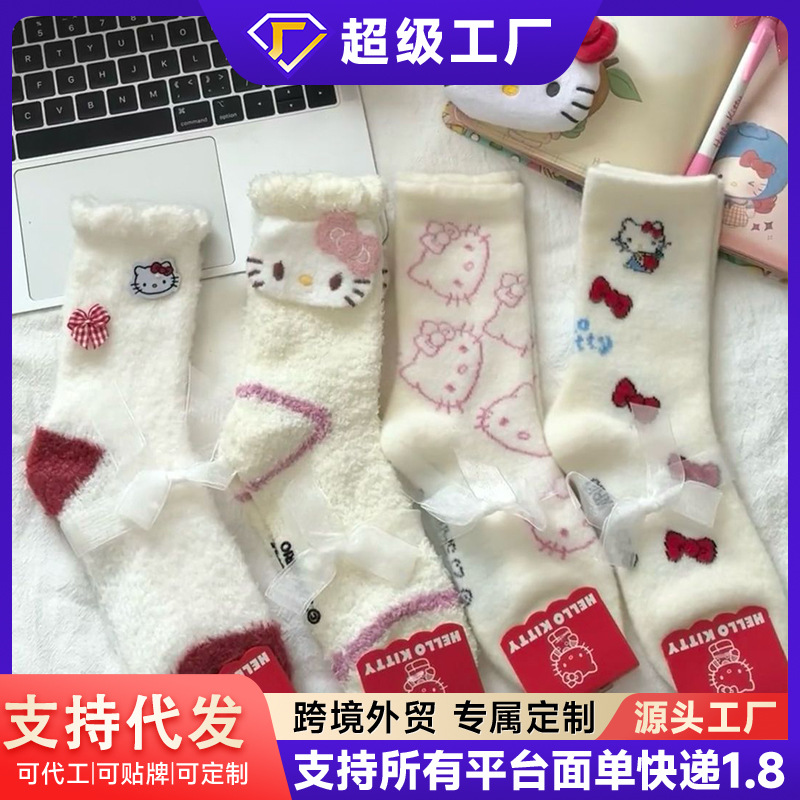 新款ins可爱厚袜子秋冬保暖卡通kt猫毛绒家居地板袜软糯中筒甜美