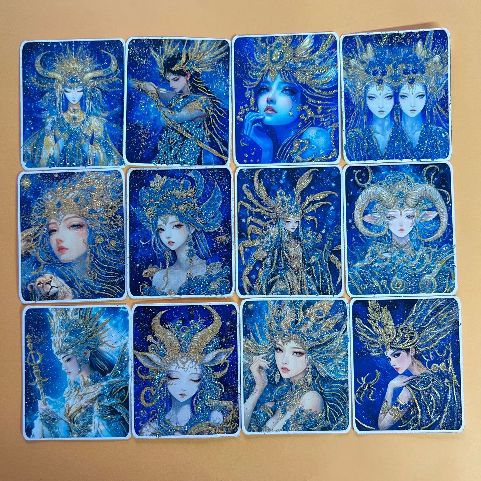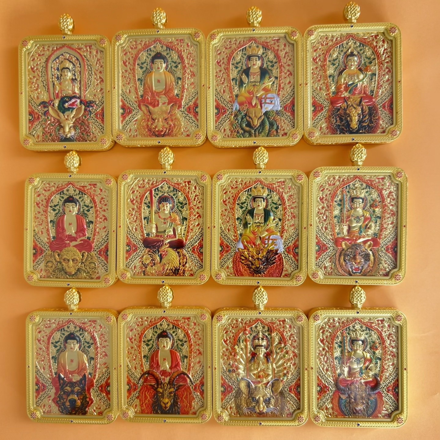 Meisa Tangka 半手描き 12 星座の誕生仏ペンダント 守護仏 星座祝福カード 両面塗装金メッキシェル