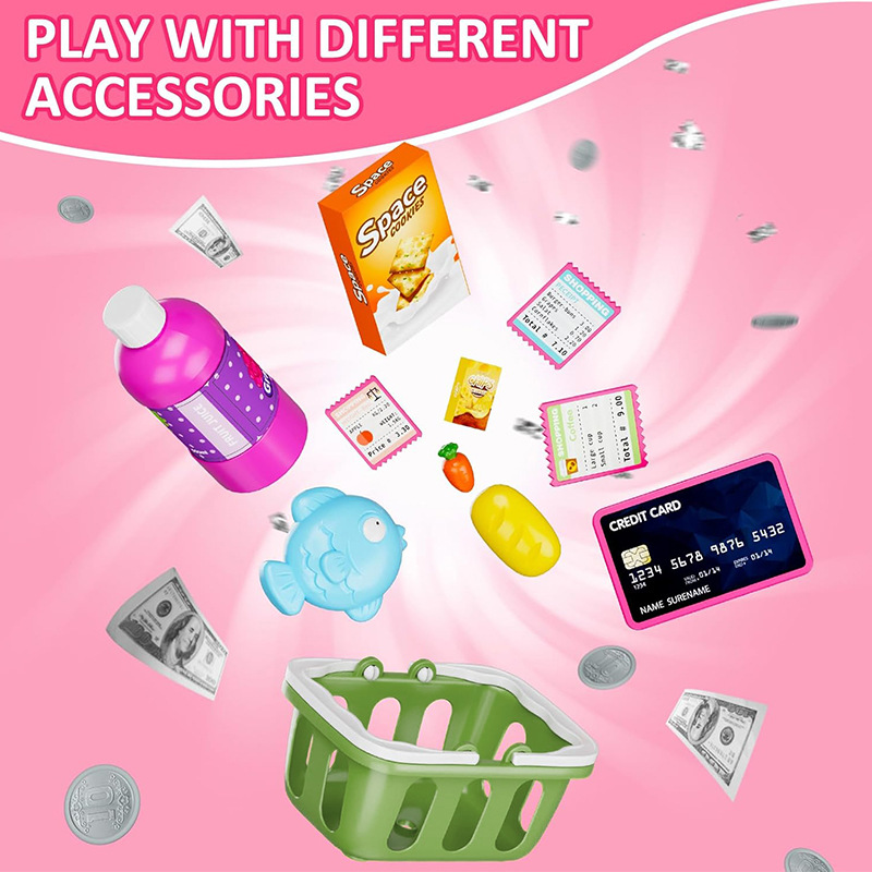 国境を越えた子供用ままごとレジ POS マシンおもちゃのショッピングバスケット、コンピューター機能付き子供用ままごと遊び