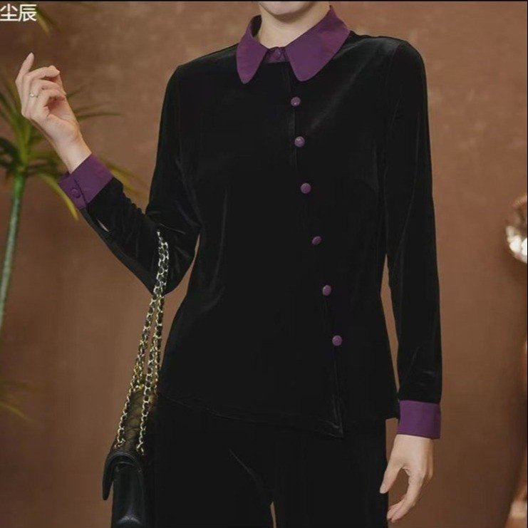 一件代发直播爆款2025秋季新款时尚拼色翻领丝绒长袖打底衫妈妈装