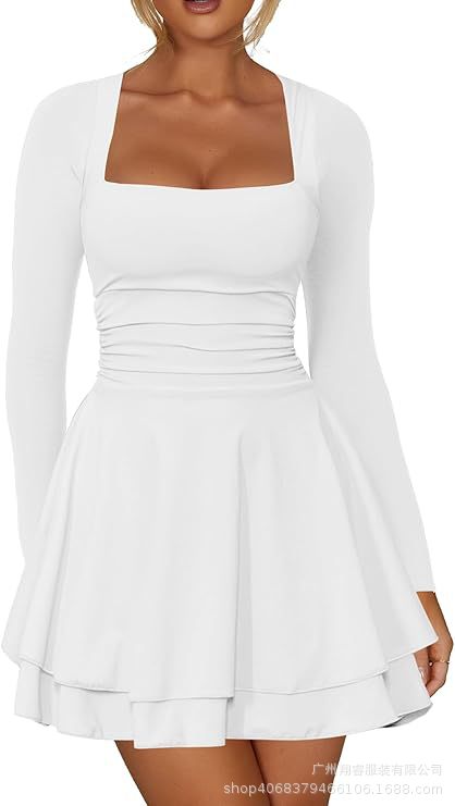 ヨーロッパとアメリカのアマゾン 2025 女性のスクエアネックプリーツ裾ドレスウエスト長袖タイトショートパーティードレス
