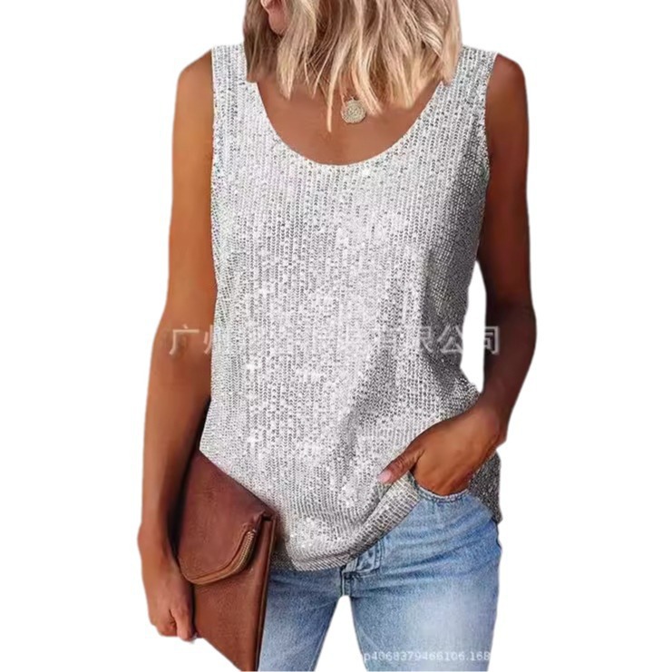 スパンコールキャミソール2024新型国境を越えた対外貿易上着アマゾン欧米女装ファッション丸襟シャツ