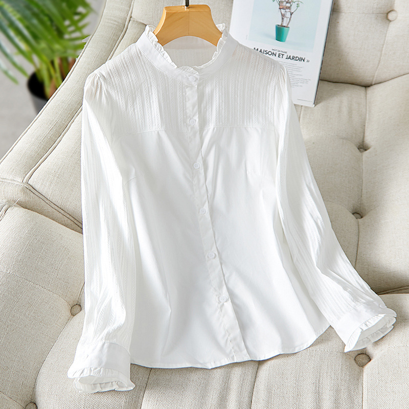 綿織り木耳襟白シャツ2025秋デザイン性抜群トップス精梳綿オフィス用インナーシャツ