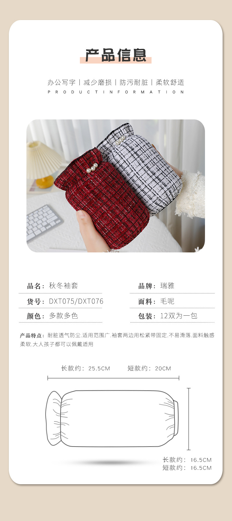 小香风加厚短款粗毛呢防污护袖套女工作学生耐脏羽绒服套袖成人冬
