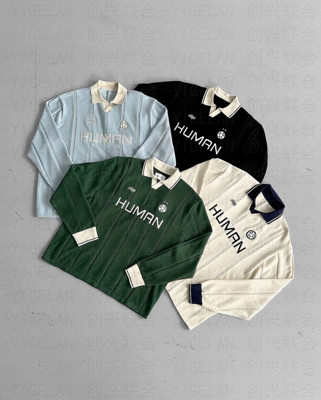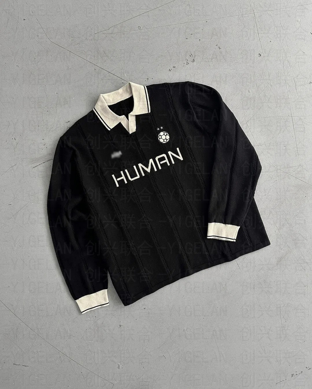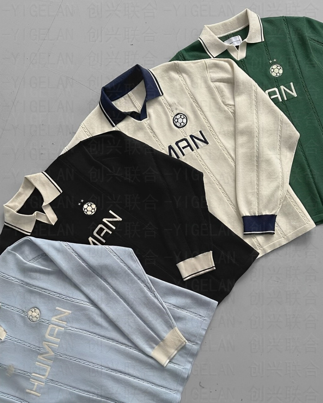 2025秋冬アメリカンレトロジャージ風縦縞ニットセーター男女兼用、レタープリントPOLO襟付きセーター