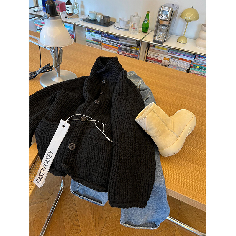 慵懒高级感黑色立领软糯麻花毛衣外套秋冬新款加厚宽松针织衫上衣