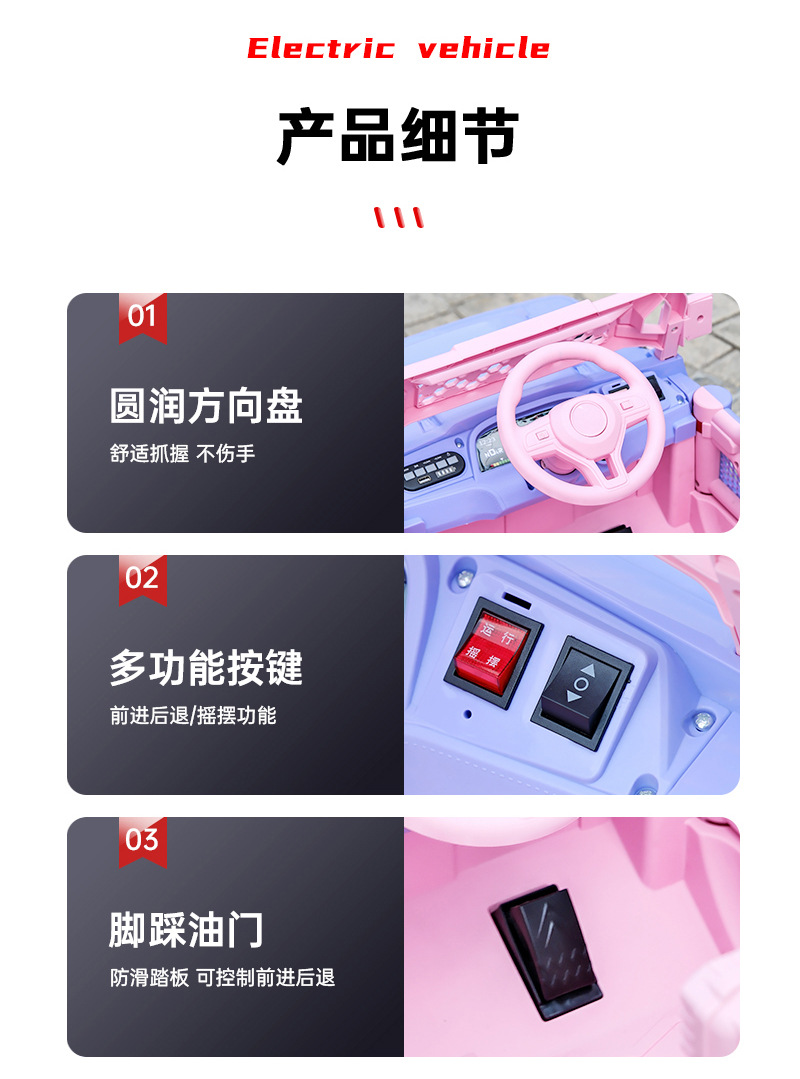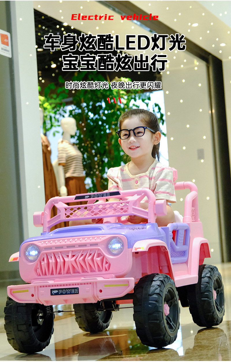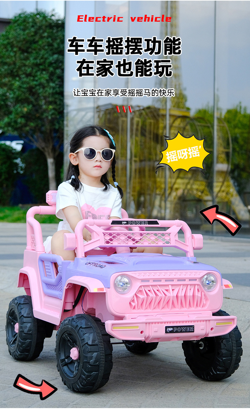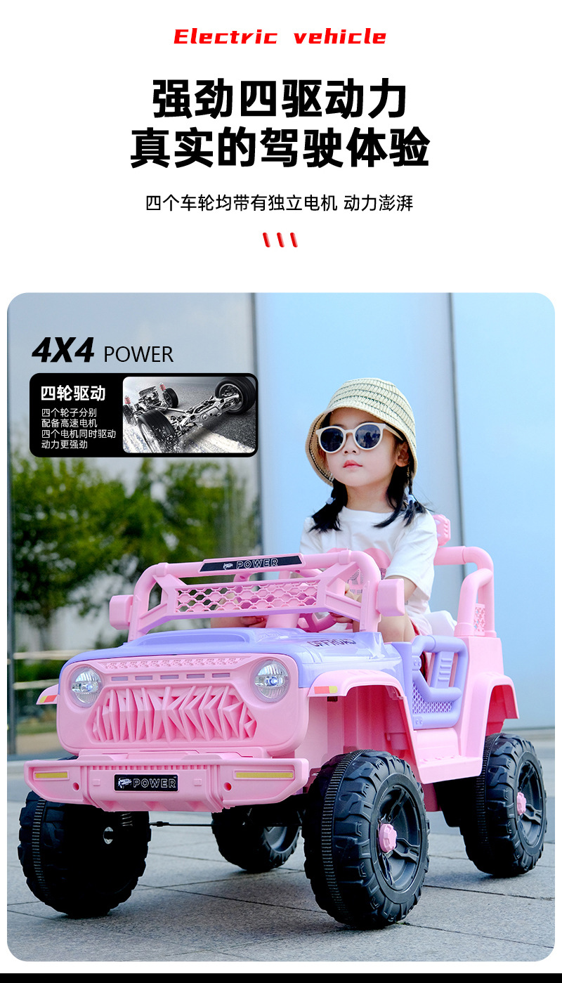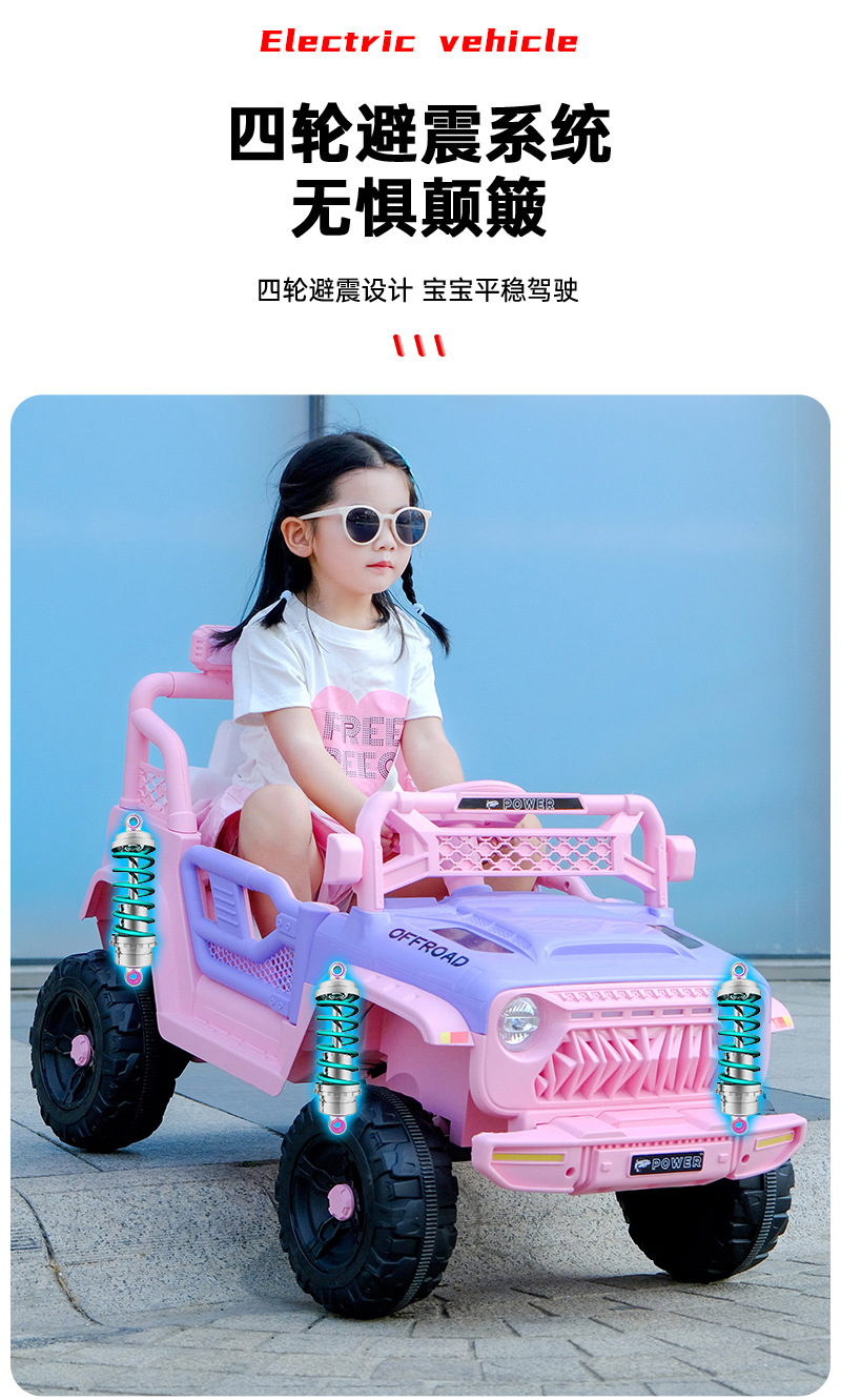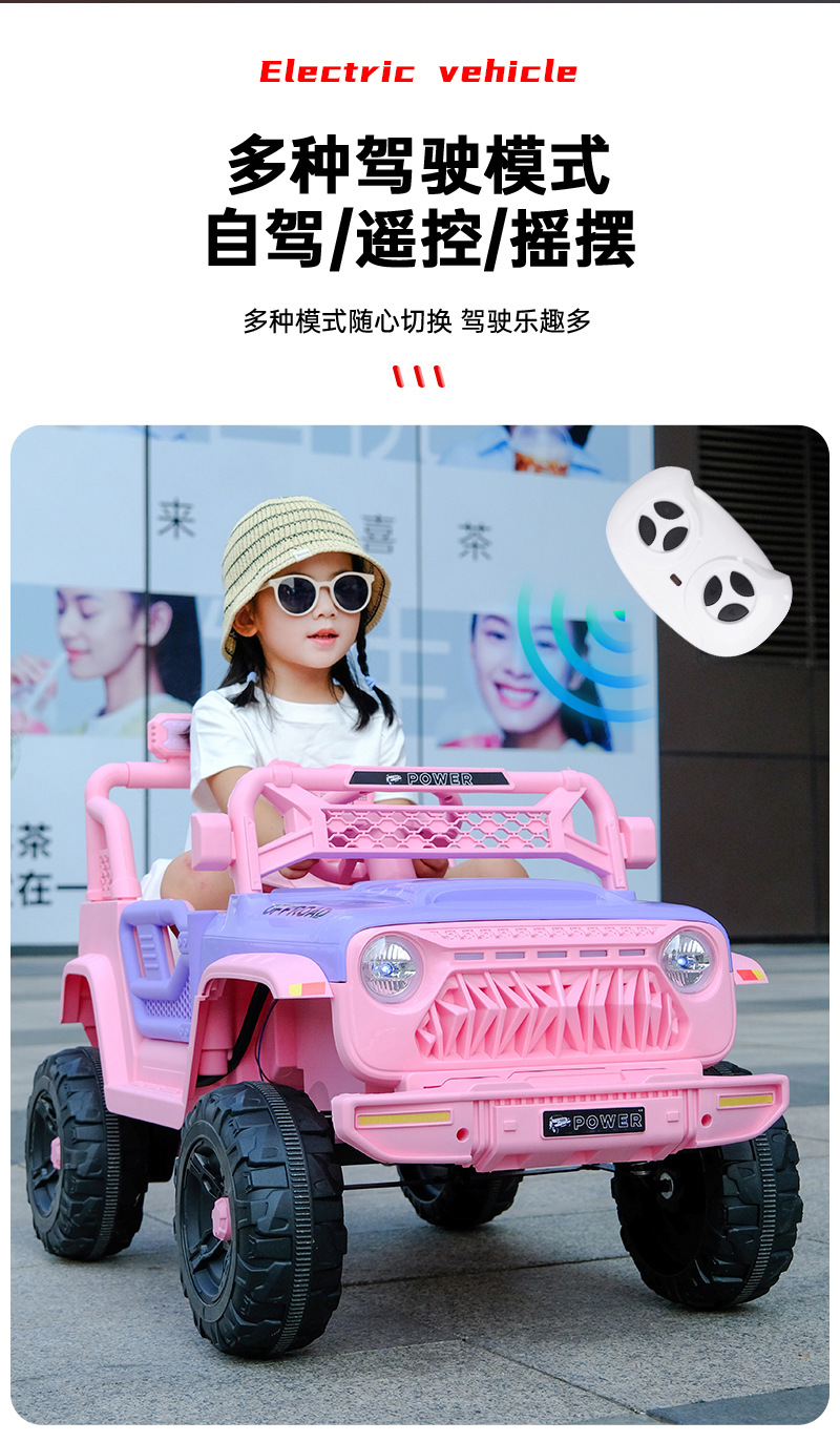 【一键开关】【电量显示】【音乐】【四轮避震】【多媒体音乐播放器】【手机APP】 【独立灯光开关】【电子摇摆】【USB插口】.4G一对一兰牙遥控【一键安装多功能方向盘】【赛克达12V4.5电瓶,双驱380电机】