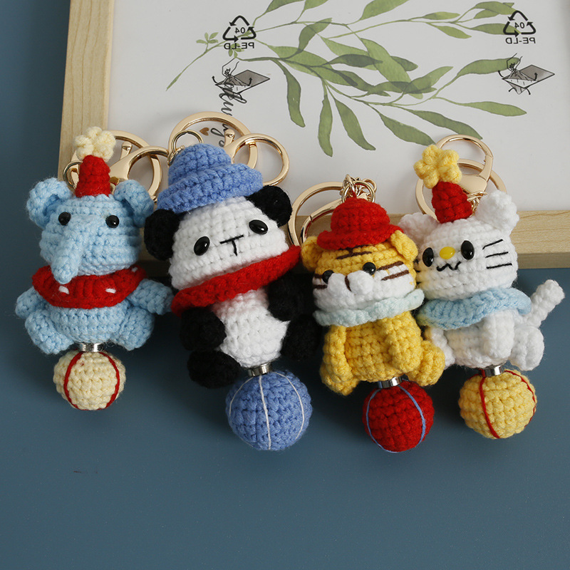 创意手工编织马戏团动物玩偶 毛线钩织旋转球球钥匙扣 手作包挂饰
