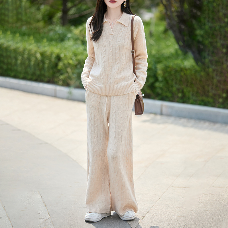 双股加厚Polo翻领扭花100纯羊毛衫女装麻花毛衣阔腿长裤两件套装