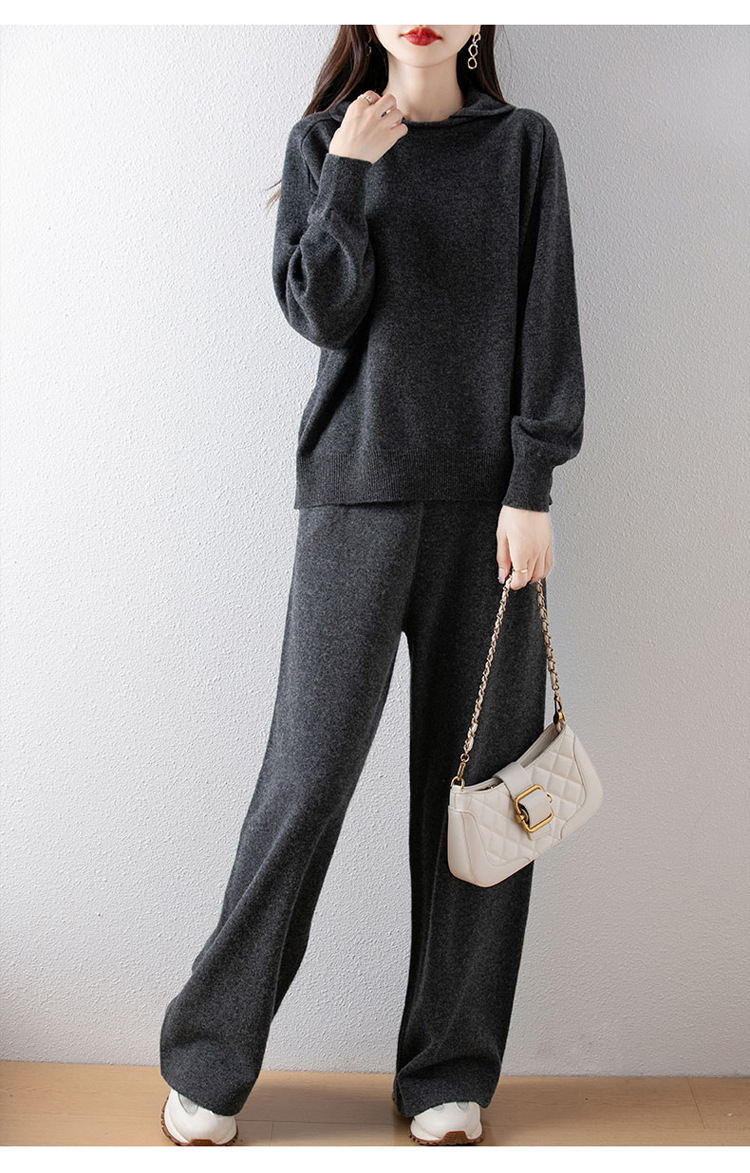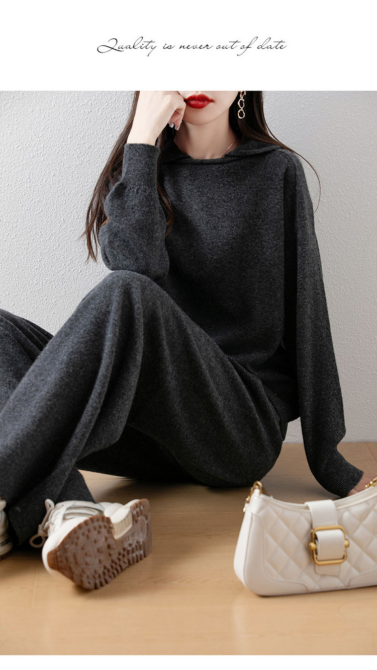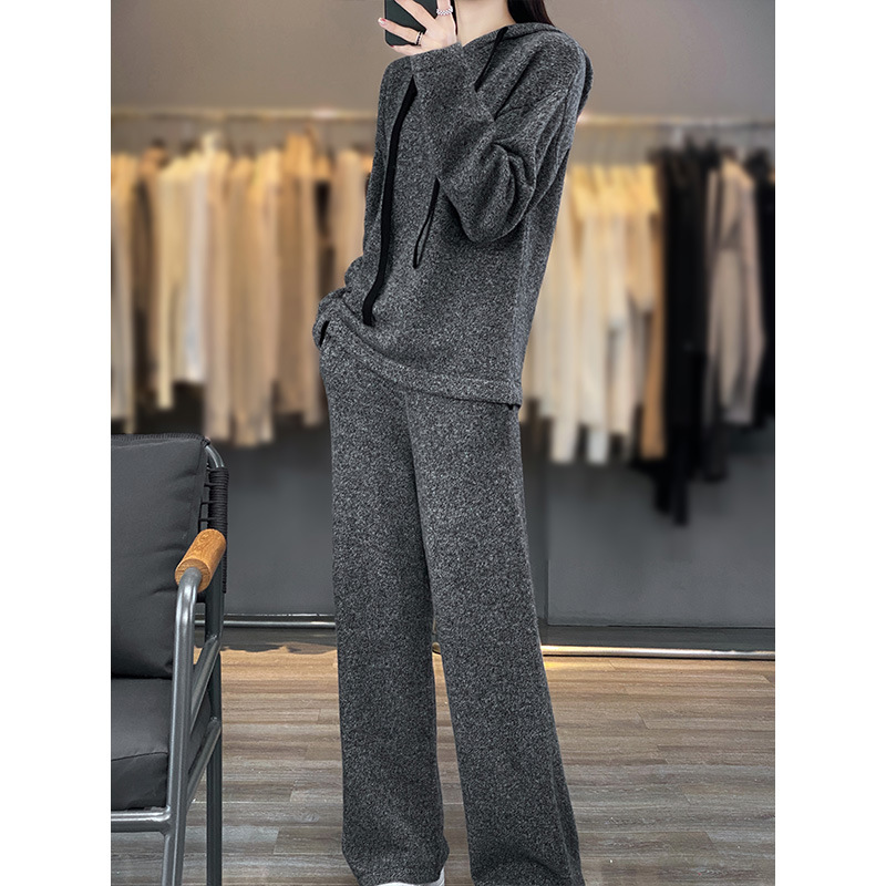 2025年空气层连帽羊毛毛衣女慵懒宽松阔腿裤两件套装洋气针织加厚