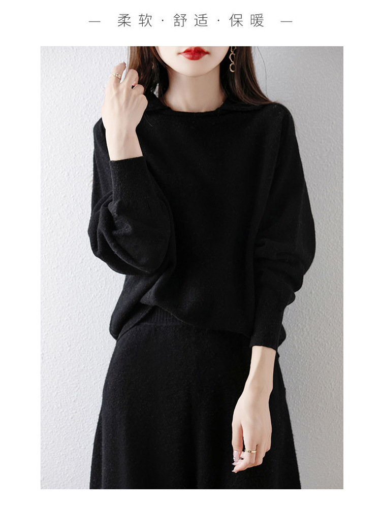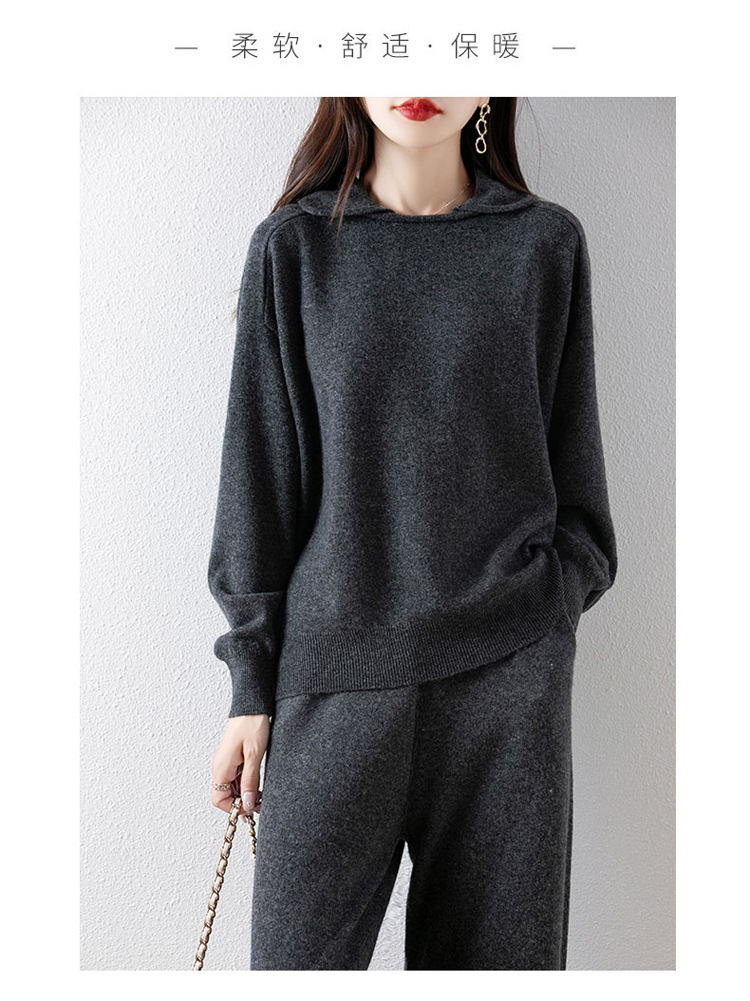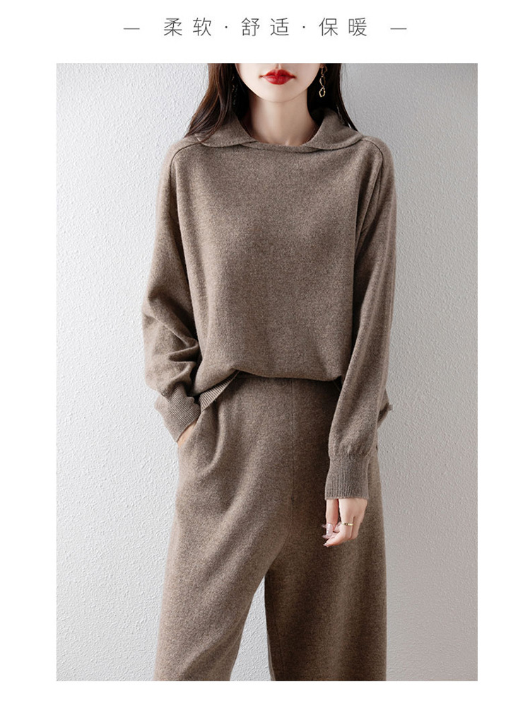 2025秋冬新款撞色连帽羊毛衫上衣阔腿裤两件套宽松休闲气质毛衣套