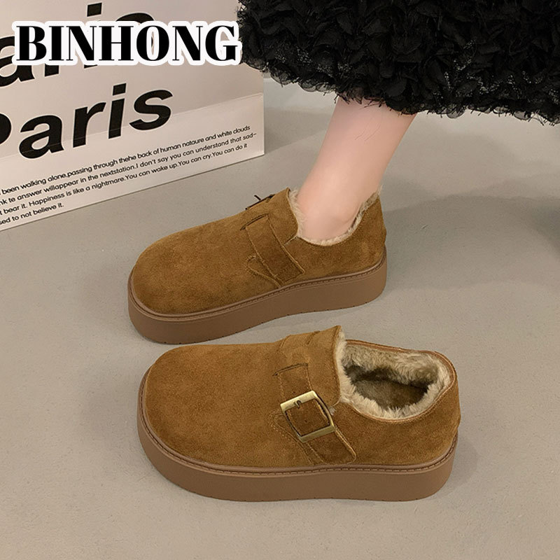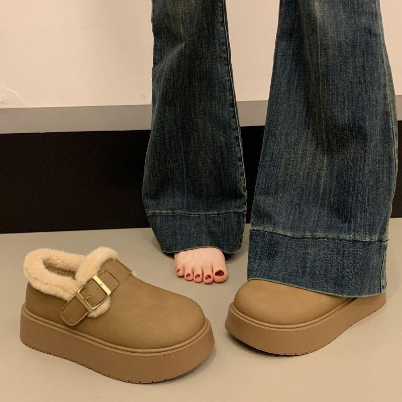 本革厚底裏起毛ビルケンシュトック風シューズ レディース 2025年秋冬新作 暖かい豆豆風コットンシューズ アウトドア用ファー付きスノーブーツ
