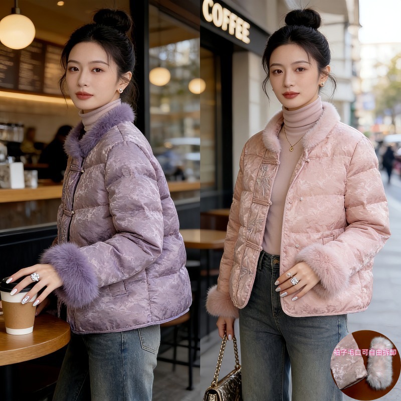 中年妈妈新中式毛领短款棉服女冬季仿狐狸毛袖口外套气质冬装棉袄